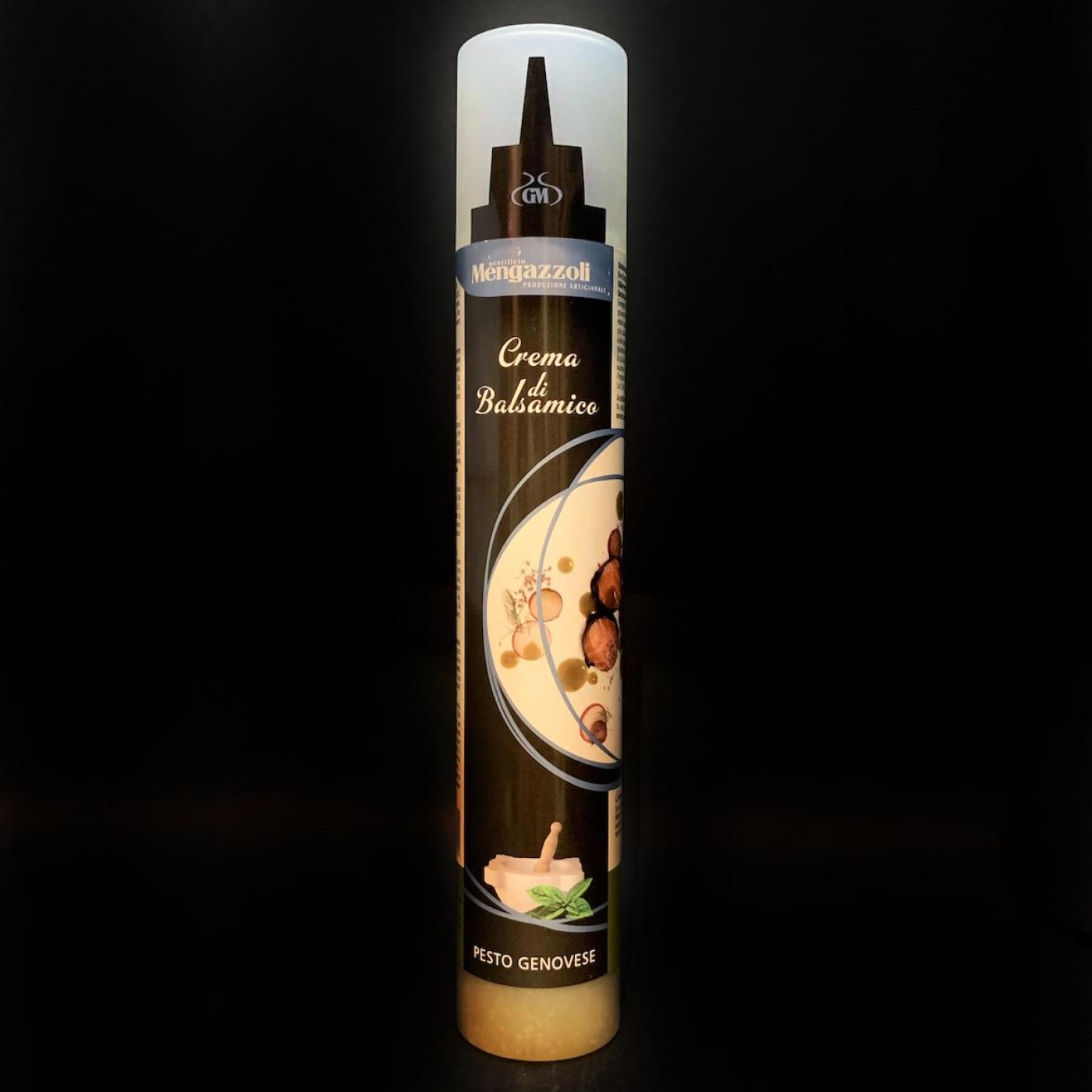 Crema di Balsamico Pesto Genovese – кисло-солодкий бальзамічний крем з додаванням песто. В основі фруктовий оцет та концентрований виноградний сік, а в якості додатків: оливкова олія Екстра Вірджин, базилік, кедрові горіхи, пармезан та часник. Разом вдалось досягти неймовірного смаку та аромату.