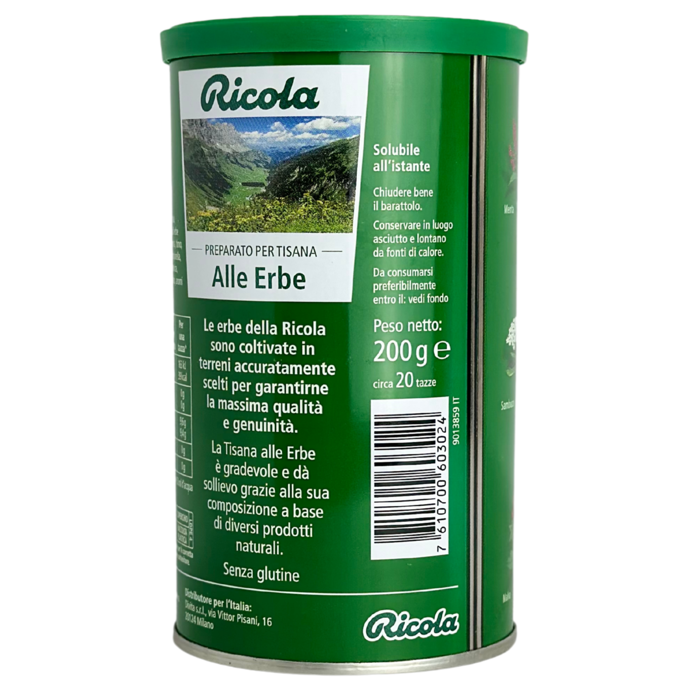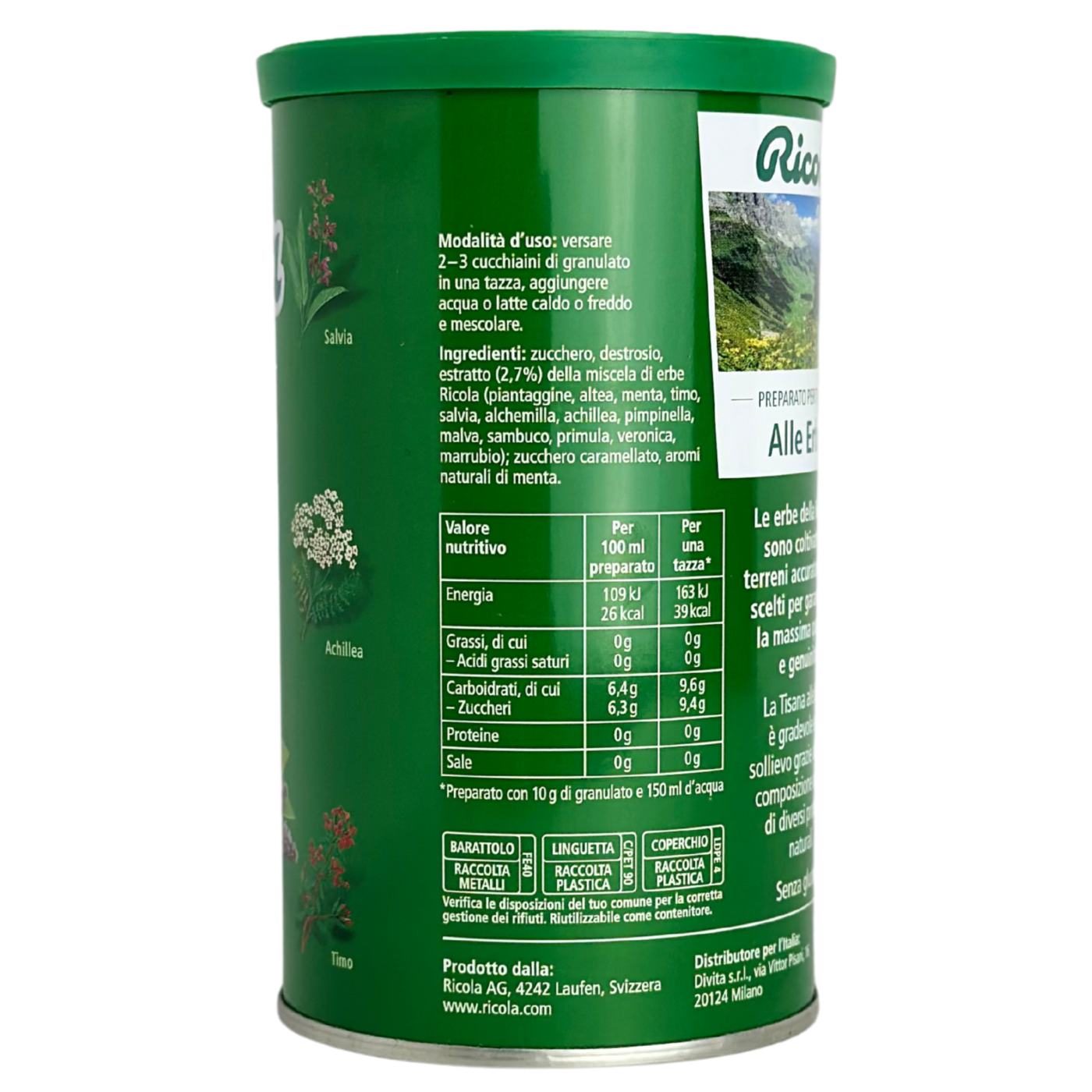 Alle Erbe Ricola – це надзвичайно корисний трав’яний чай, який смакуватиме в обох варіантах – як гарячим, так і холодним. Він містить екстракти 13 корисних трав зі Швейцарії: подорожник, алтея лікарська, м’ята перцева, чебрець, шавлія, манжетка, деревій звичайний, бедринець, калачики (мальва), бузина, первоцвіт, вероніка і шандра. Також в складі натуральний ароматизатор ментолу, тому напій ще має освіжаючий ефект.