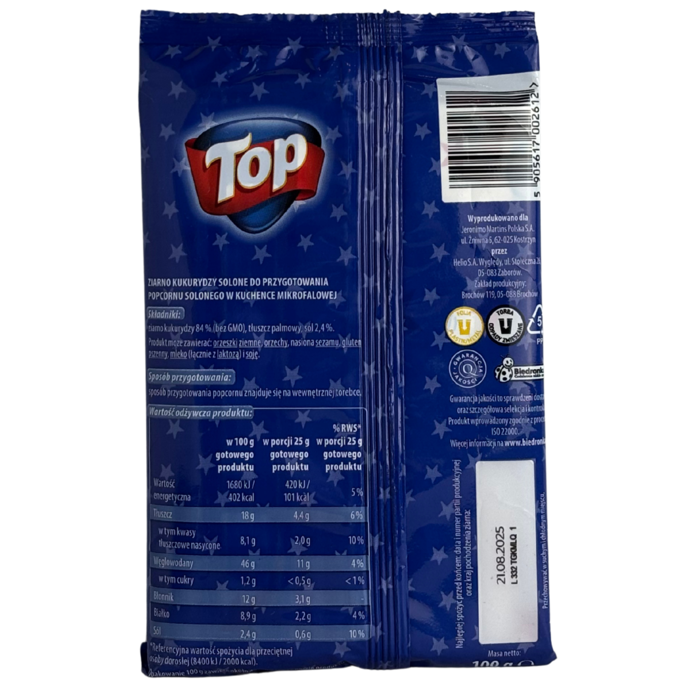 Попкорн солений для мікрохвильової печі Top 100g - це дуже смачний та класний перекус для поціновувачів солоного. Такий продукт дуже швидко та просто приготувати. Потрібно поставити попкорн в мікрохвильову на 4 хв. і готово можна насолоджуватись перекусом. Можна брати з собою в кіно чи на прогулянку.