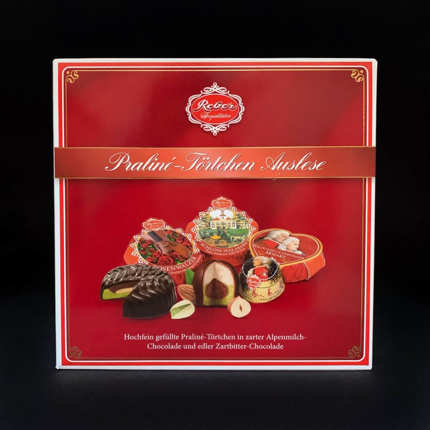 Praline-Tortchen Auslese – асорті дивовижних цукерок від німецького виробника Reber, які зведуть з розуму своїм особливим смаком. Тут ви знайдете різноманітні начинки: фісташковий та мигдалевий марципан, горіхова нуга, родзинки в ромі та бренді, хрусткі рисові кульки та інші. Самі цукерки вкриті насиченим темним та надзвичайно ніжним молочним шоколадом.
