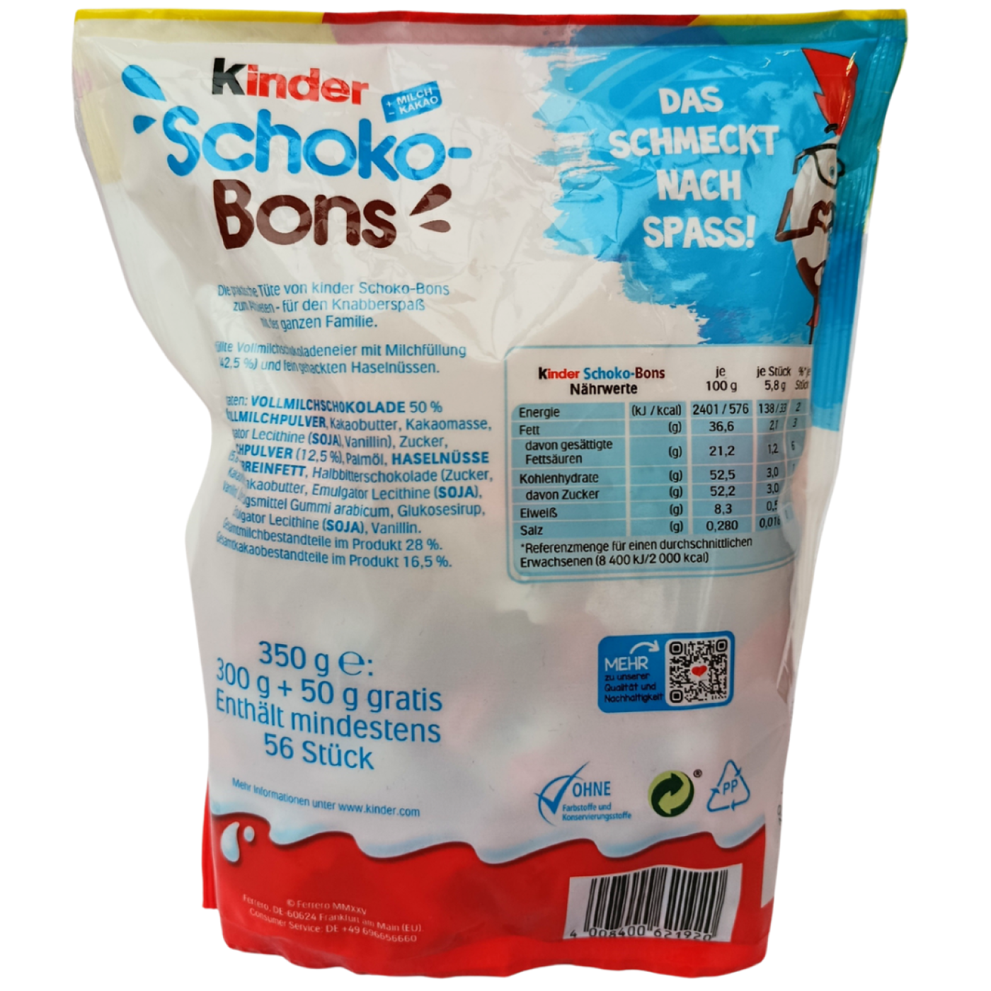 Schoko-Bons – надзвичайно смачні шоколадні цукерки з молочного шоколаду від відомого виробника Ferrero, які містять делікатний молочний крем та шматочки лісових горіхів. Смаколик неодмінно сподобається і дітям, і дорослим, адже він не тільки чудово смакує з улюбленим гарячим напоєм, але й піднімає настрій та дарує сили. Не містить барвників і консервантів. Оригінальна форма яєць дозволяє використовувати їх в якості прикраси для кондитерських виробів, особливо під час Великодніх свят.