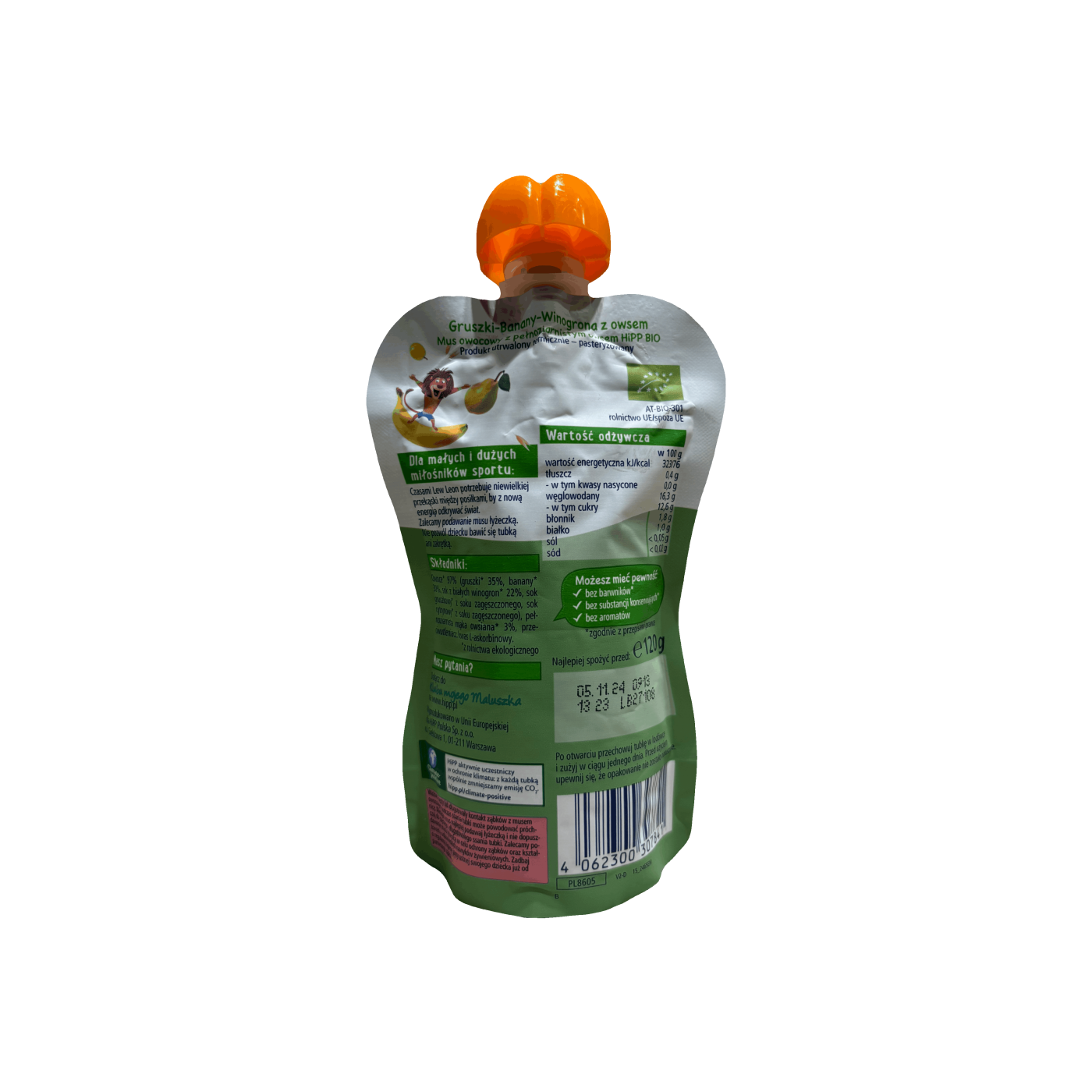 Дитяче фруктово-злакове пюре від Hipp це смачний і корисний перекус для активних малюків віком від 1 року. Продукт виготовлений з органічних фруктів: груші, яблука та винограду, з додаванням цільнозернового вівсяного борошна. Не містить цукру штучних барвників та ароматизаторів.
