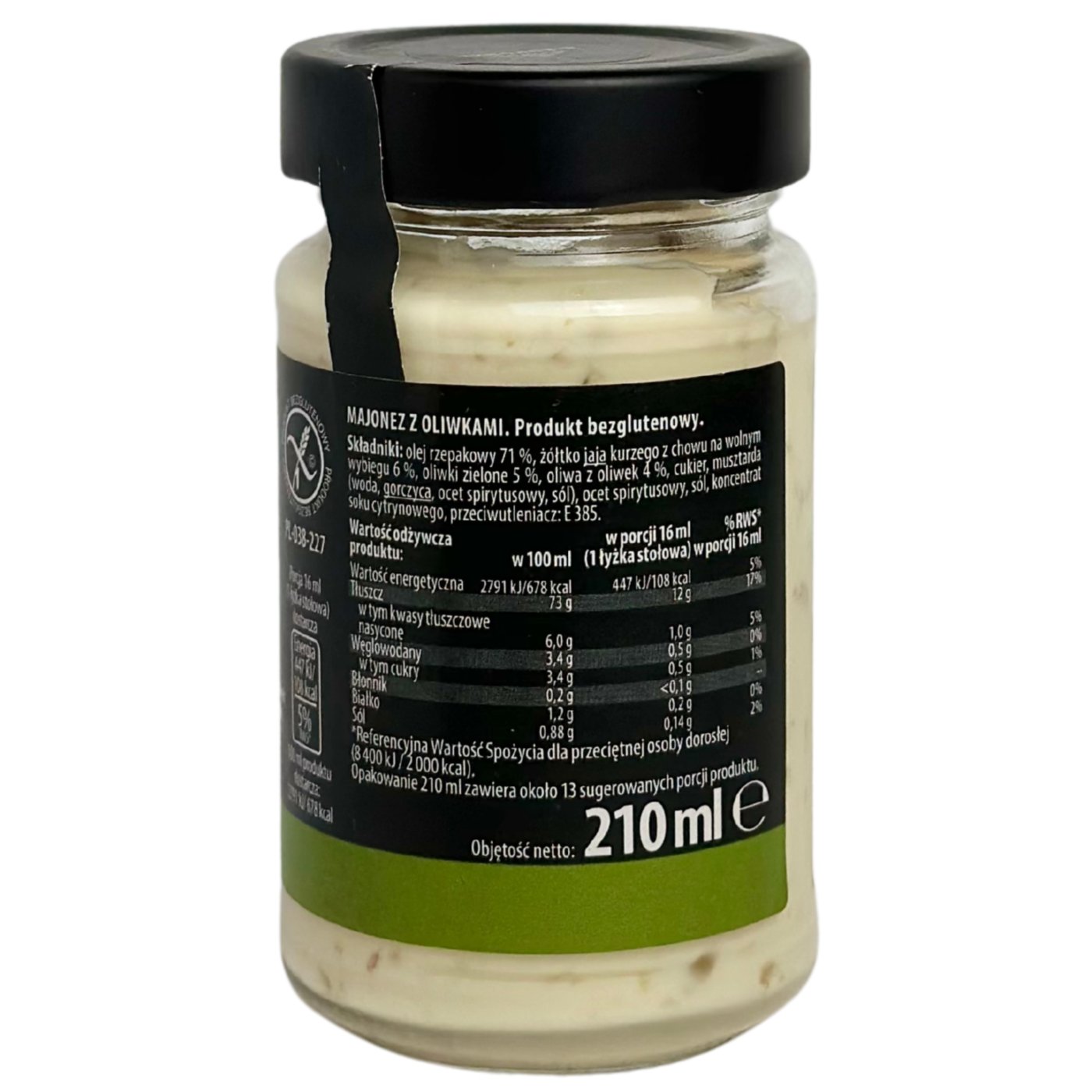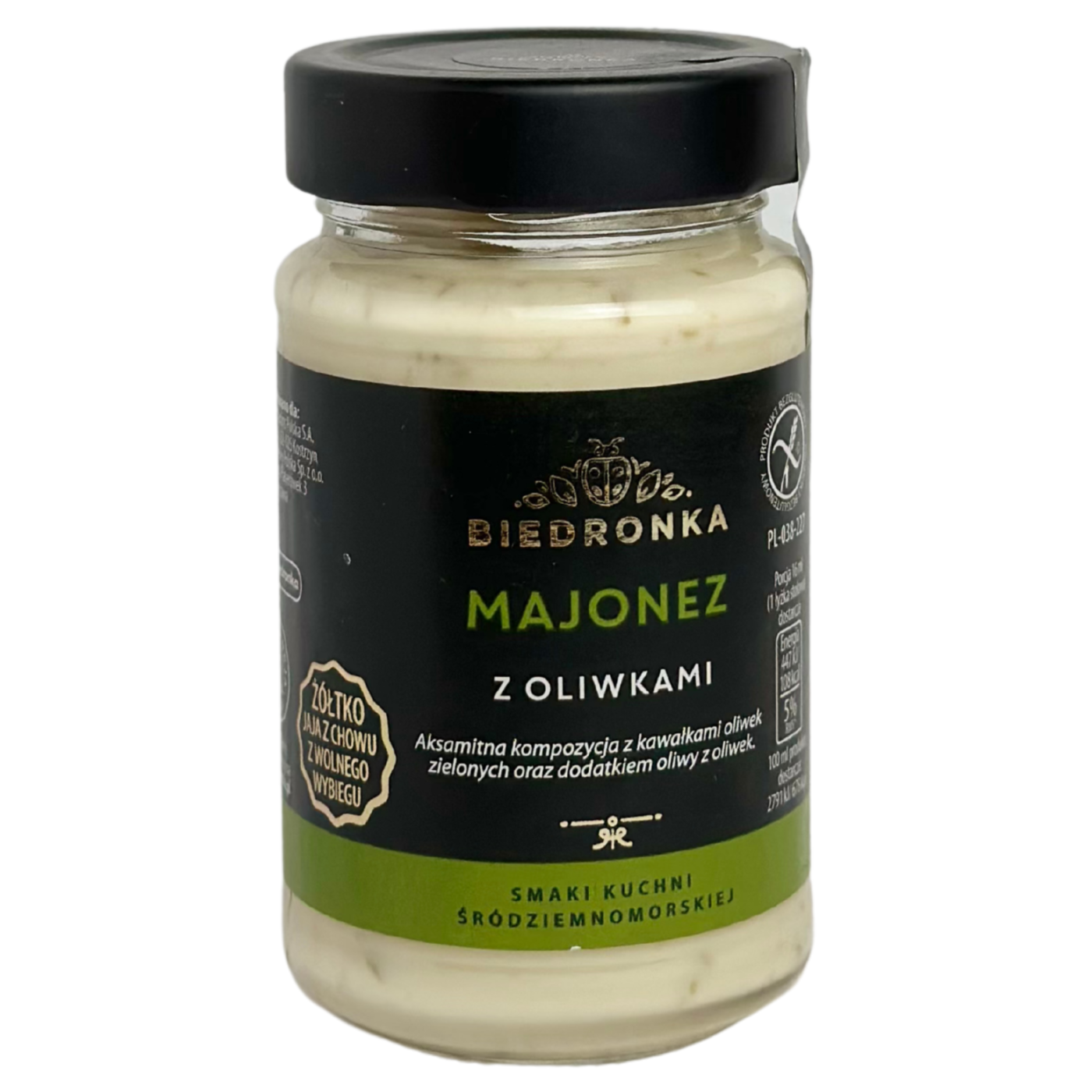 Майонез з оливками виготовлений на основі класичної рецептури майонезу Провансаль з додаванням оливкової олії, подрібнених зелених оливок. Оливкова олія надає класичному майонезу неповторного та вишуканого смаку та виняткової консистенції. Це 100% натуральний майонез, він не містить крохмалю, консервантів, стабілізаторів, Е-добавок та ГМО. Натуральний майонез з оливками ідеальний для заправки салатів, також його можна застосовувати для рибних, м'ясних та овочевих страв.