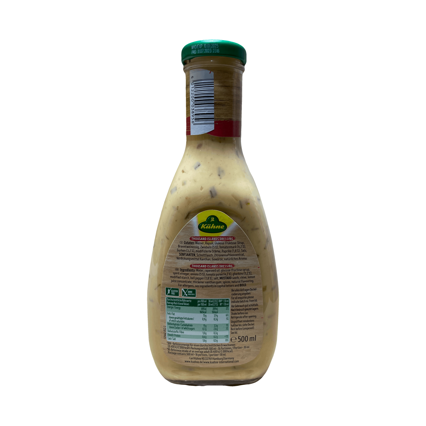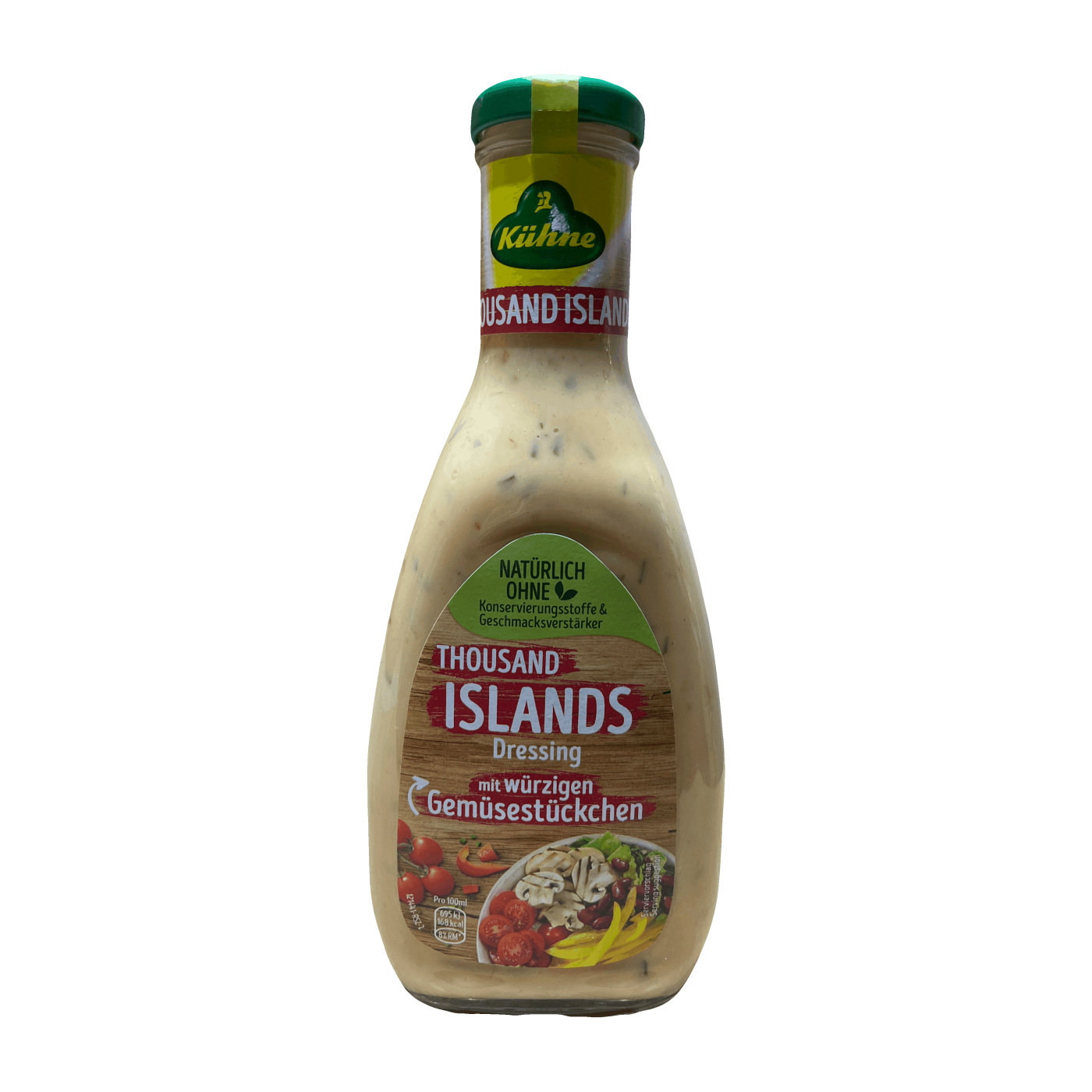 Вершково-гостра заправка «Тисяча островів» з дрібно нарізаними шматочками овочів виготовлена за американським рецептом. Ідеально поєднюється з листковими та овочевими салатами, коктейлем з креветок або вареними яйцями. Огірки нарізані кубиками, цибуля, мелений перець та духм'яні спеції надають соусу особливого насиченого смаку.