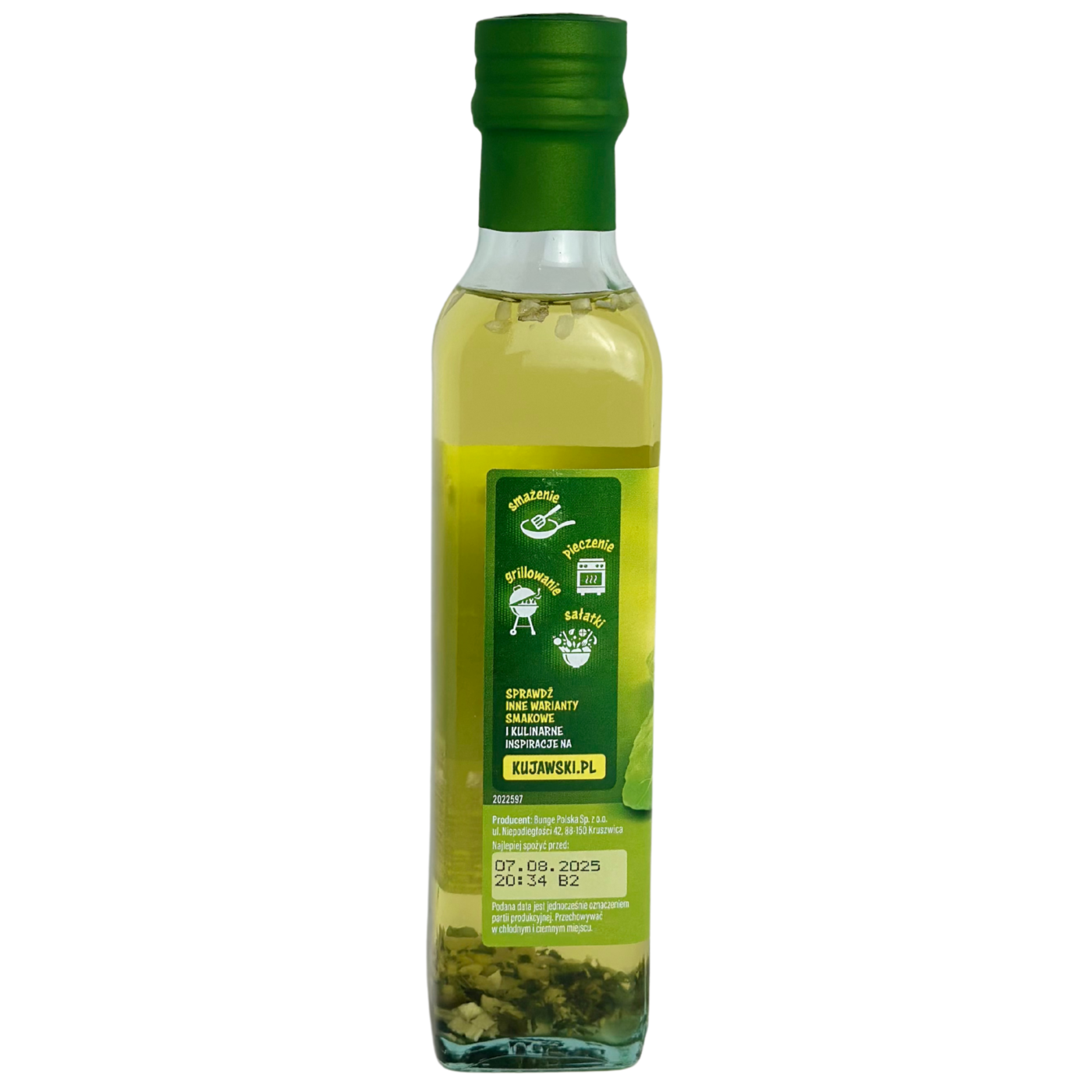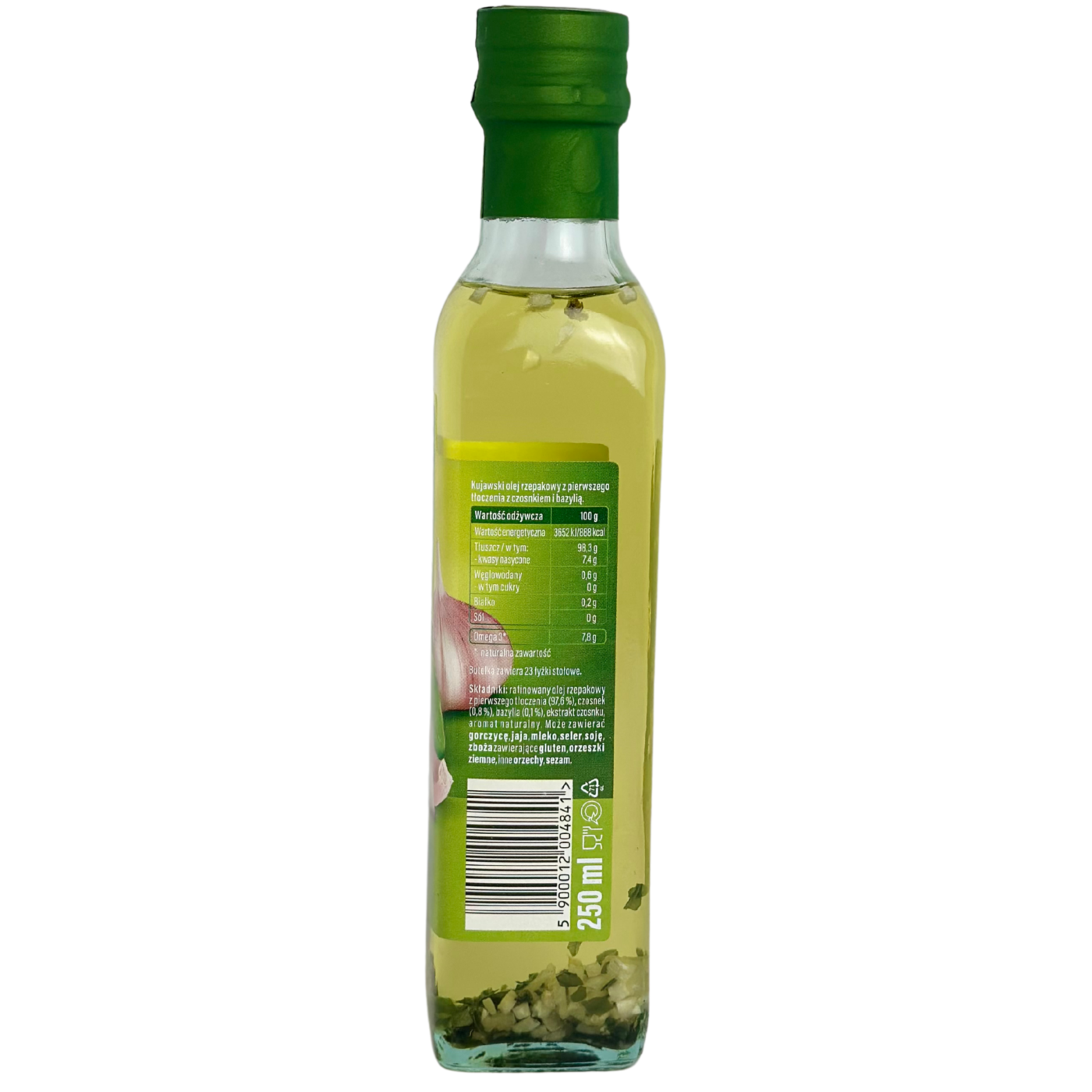 Ріпакова олія виготовляється виключно з натуральних компонентів. У складі, крім рафінованої ріпакової олії, присутні також сіль, шматочки подрібненого часнику і базилік, які надають приголомшливого смаку і насиченого аромату. Якщо ви в пошуку ідеальної заправки для салатів, яка була б не тільки неймовірно смачною, але й корисною, обирайте ріпакову олію від польського виробника Kujawski.