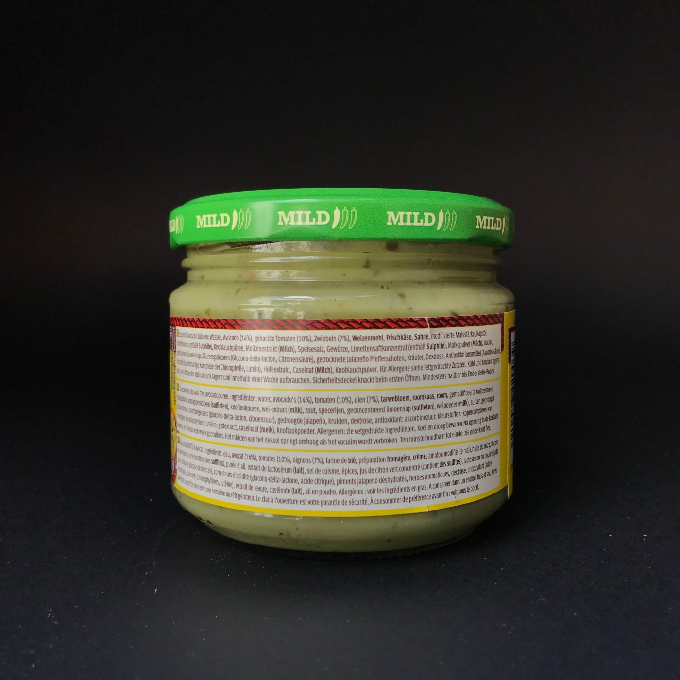 Склад: вода, авокадо, помідори, цибуля, пшеничне борошно, кремовий сир, сметана, модифікований кукурудзяний крохмаль, ріпакова олія, картопляні пластівці, часникове пюре, екстракт сироватки (з молока), сіль, спеції, концентрований сік лимону, халапеньйо, зелень, глюкоза, аскорбінова кислота, барвник, екстракт дріжджів, часник в порошку.
