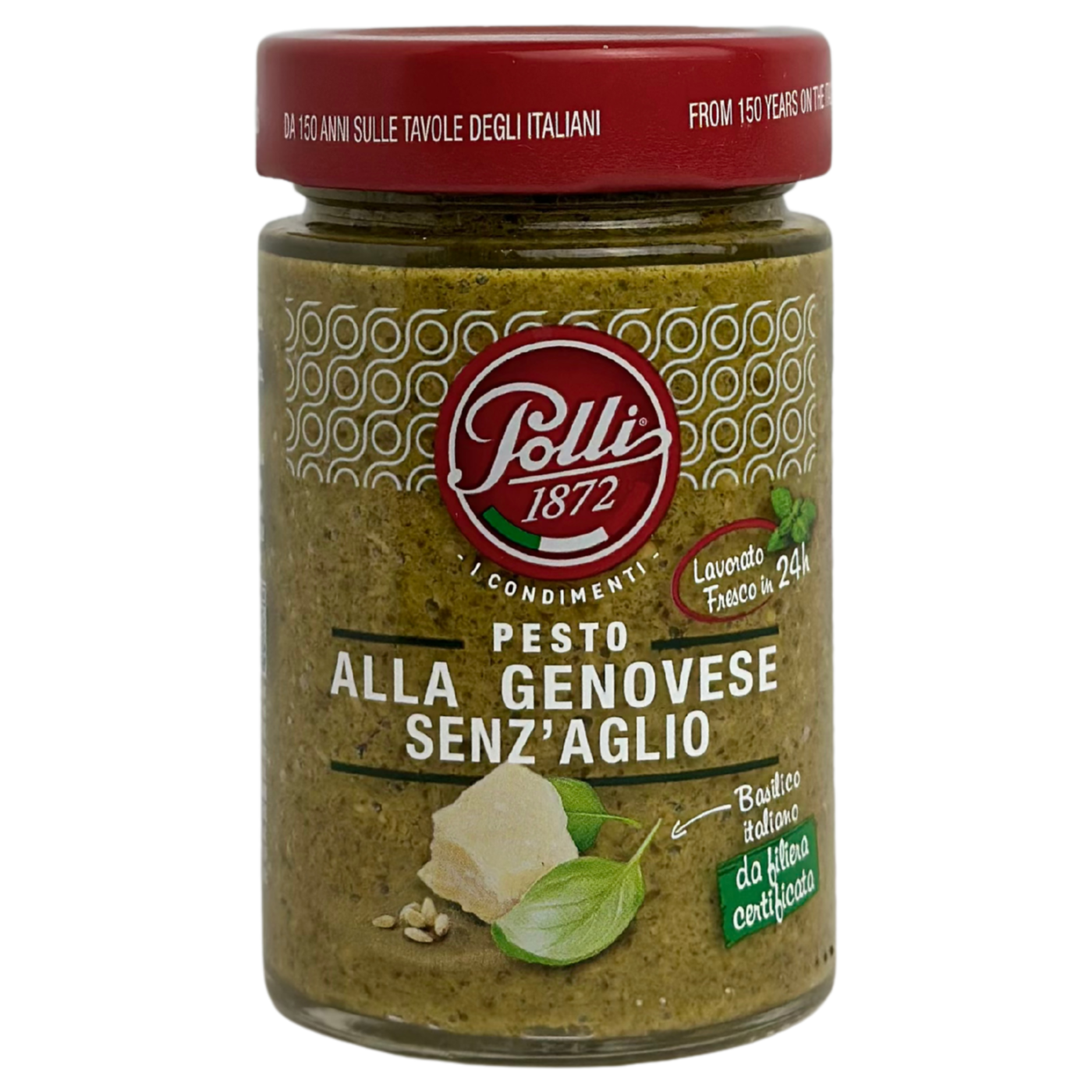 Pesto senz'aglio від італійського виробника Polli не містить часнику, він смакуватиме в пасті, лазаньї, салатах, закусках, також його додають до риби.