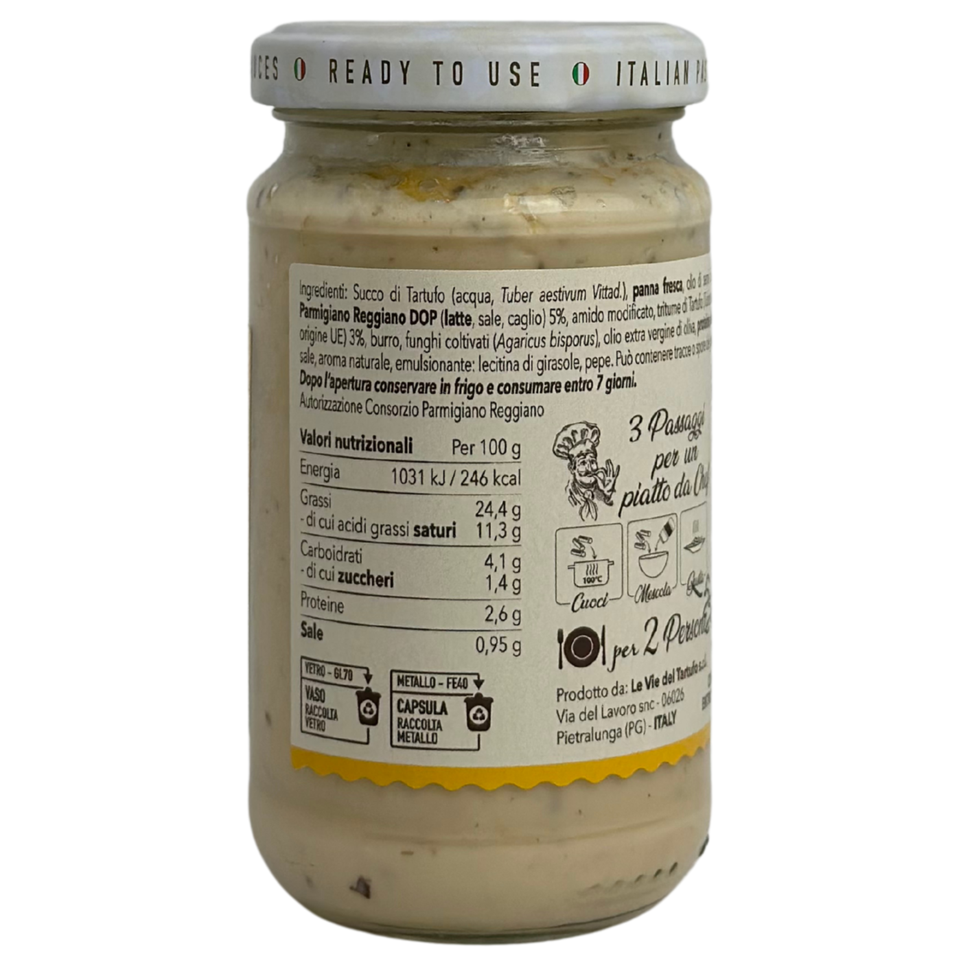 Соус з чорним трюфелем і пармезаном - це справжня знахідка для шанувальників вишуканої кухні. Він вражає своєю глибокою ароматною та насиченою текстурою, створеною завдяки вдалому поєднанню інгредієнтів. Пармезан надає соусу багатошарову текстуру та насичений аромат, тоді як трюфель додає вишуканості та делікатного смаку. Цей соус ідеально підходить як доповнення до пасти, різотто, м'ясних страв, а також може використовуватися як база для смачних соусів та дресингів.