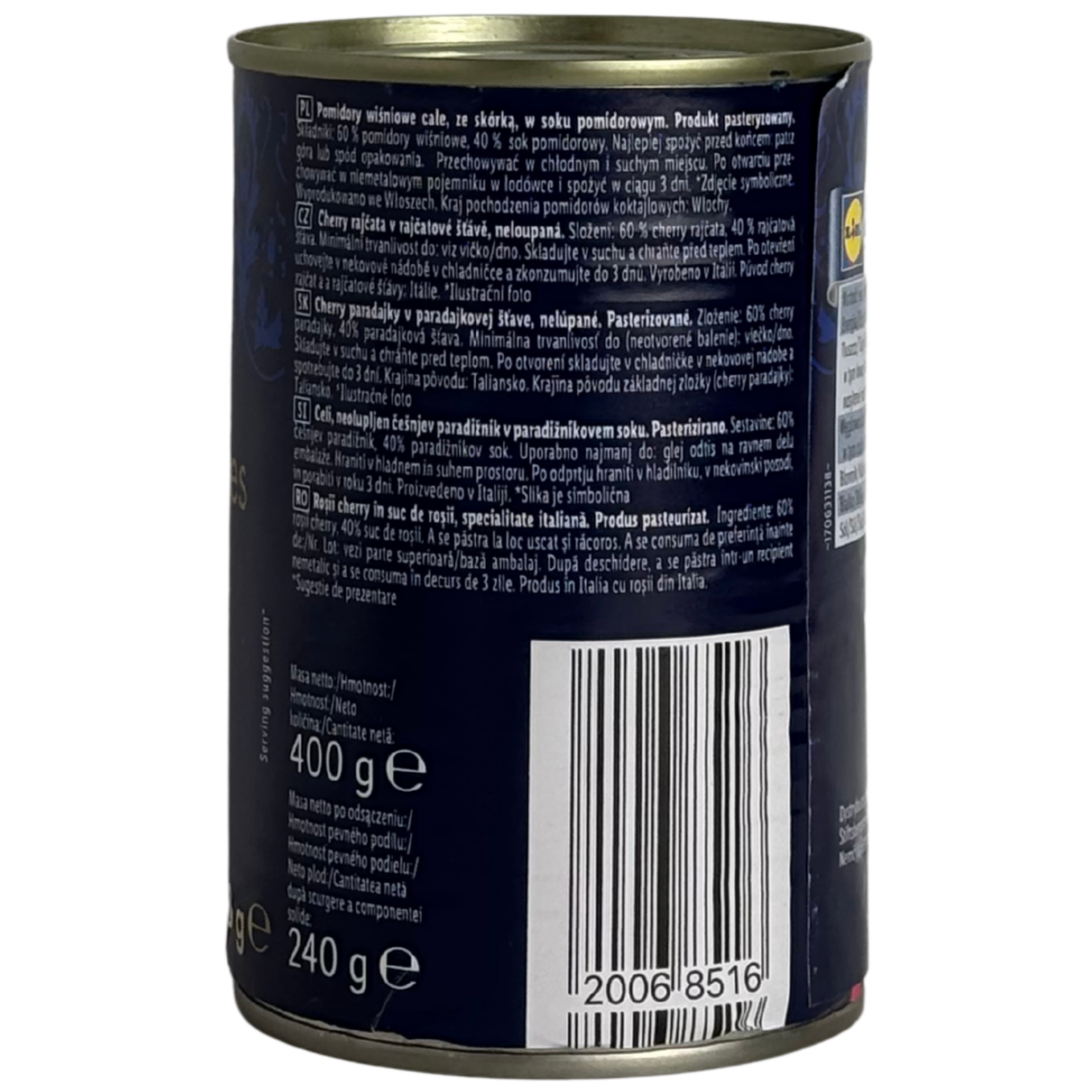 Помідори черрі в томатному соці Italiamo - це стиглі, соковиті помідори черрі, консервовані в натуральному томатному соці, що зберігає їхній свіжий аромат і солодкий смак. Завдяки ніжній текстурі та яскравому смаковому профілю вони ідеально підходять для салатів, пасти, піци, гарнірів і закусок. Помідори легко поєднуються з іншими інгредієнтами, додаючи стравам соковитості та насиченого томатного аромату, роблячи їх більш апетитними та смачними.