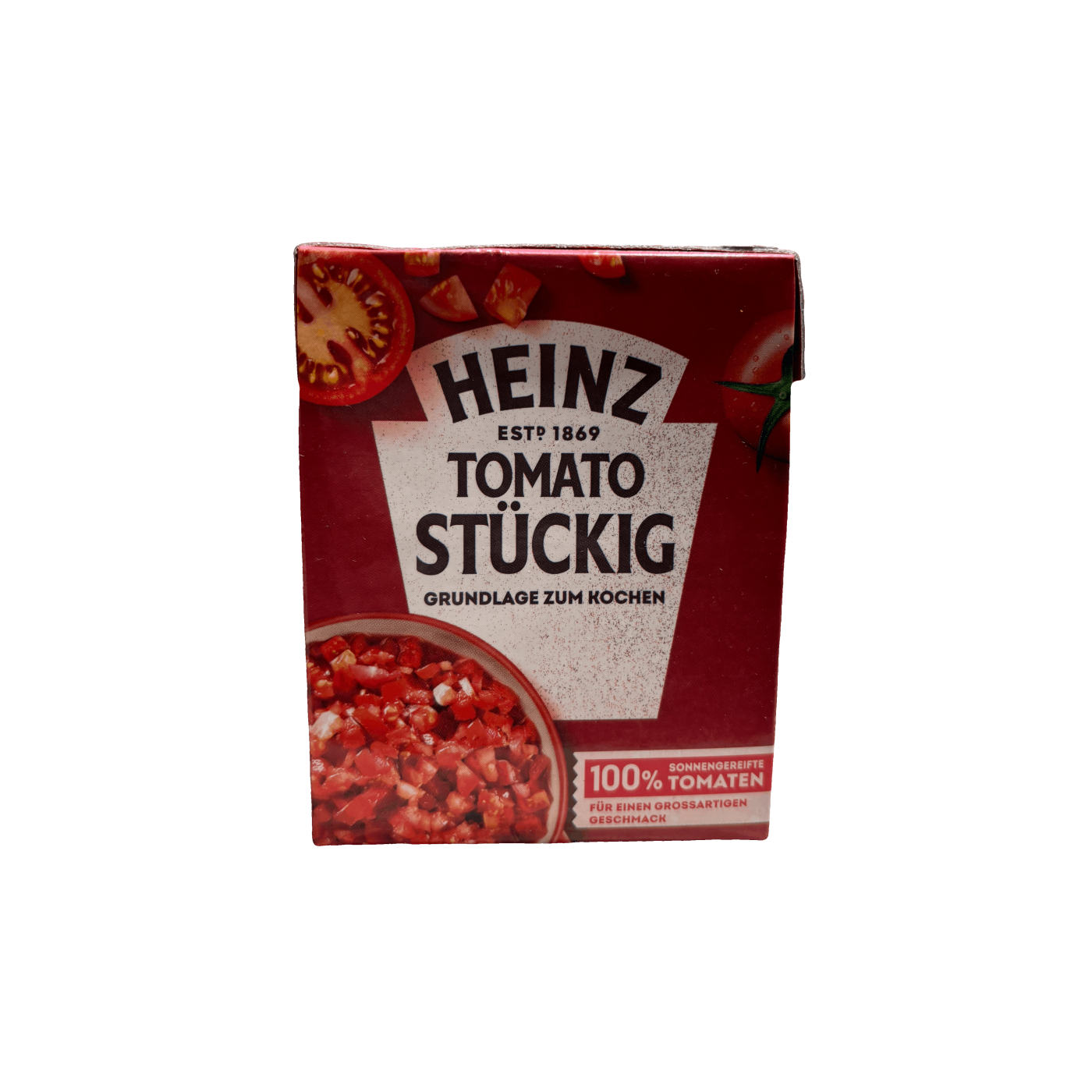 Heinz Tomato Stuckig - це нарізана кубиками м'якоть томатів у власному соку. Смак та текстура надзвичайно ароматні з  вираженою кислинкою. Суміш не містить консервантів, тому ці консервовані помідори у власному соці можна їсти навіть дітям. Ідеально підходять для приготування соусів болоньєзе, лазаньї, піци та інших страв.