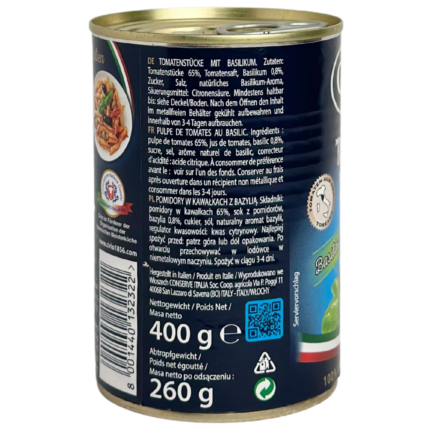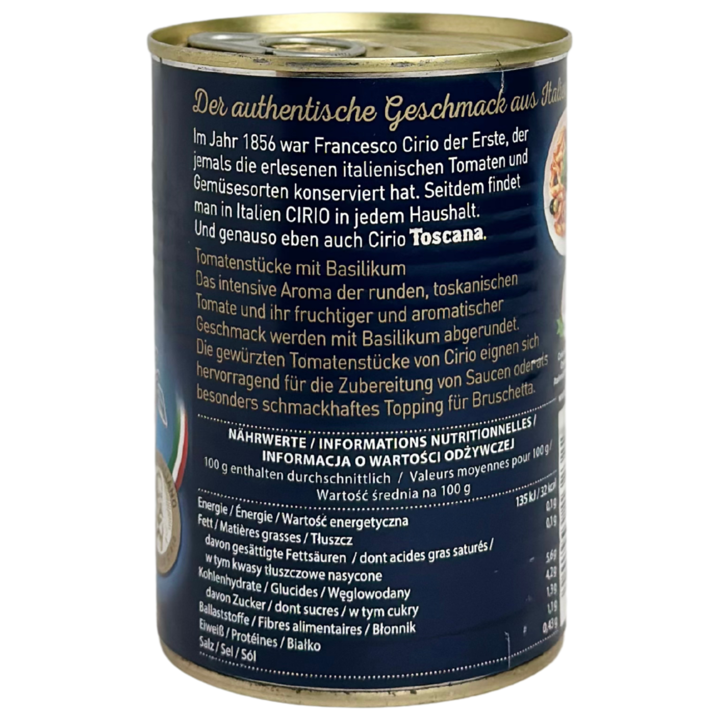 Томати кусочками з зеленню Toscana Cirio - це консервовані помідори в соку з додаванням ароматних трав, що створюють чудовий смак і аромат. Натуральний продукт, виготовлений з найкращих і стиглих помідорів, вирощених у сонячних італійських регіонах. Томати мають ніжну текстуру, ідеально підходить для приготування різноманітних страв: пасти, рагу, піци, супів або як інгредієнт для соусів.