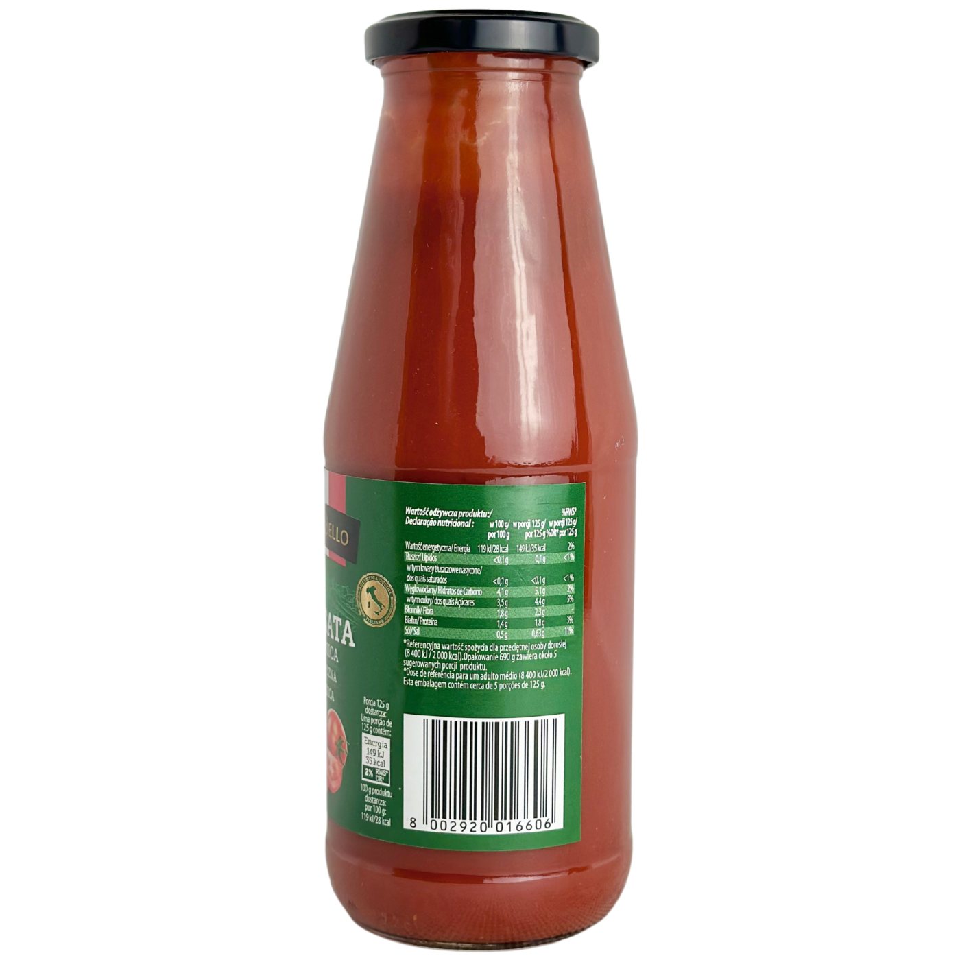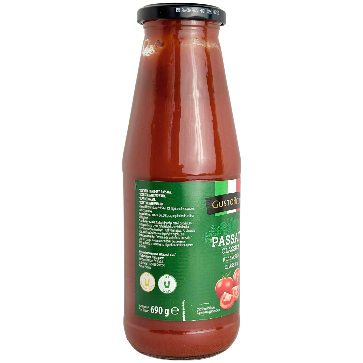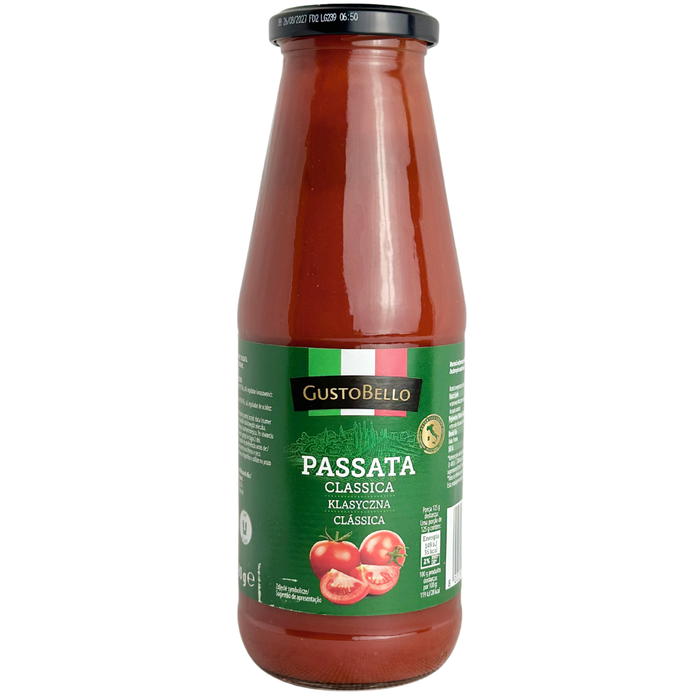 Passata GustoBello — це натуральна томатна паста з насиченим ароматом свіжих помідорів, яка стане ідеальною базою для будь-яких страв. Вона має гладку, однорідну консистенцію, що дозволяє легко змішувати її з іншими інгредієнтами для соусів, супів або рагу. Цей продукт виготовлений без додавання консервантів і штучних домішок, зберігаючи природний смак томатів. Упакована в скляну пляшку об'ємом 690 мл, вона зручна для зберігання і використання в домашній кухні. Passata GustoBello допоможе створити справжню італійську атмосферу на вашому столі. У склад входить лише помідори, вода, сіль.