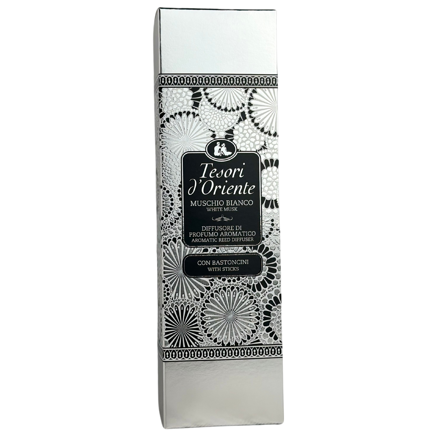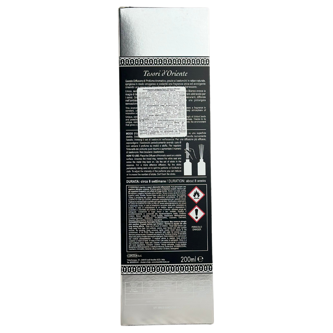 • Елегантний ароматичний дифузор із паличками Tesori d'Oriente Muschio Bianco White Musk огортає інтер'єр ніжним пудровим ароматом білого мускусу. Продукт створює атмосферу чистоти та елегантності, наповнюючи простір легкою свіжістю до 8 тижнів. Інтенсивність аромату регулюється кількістю паличок встановлених в дифузор.