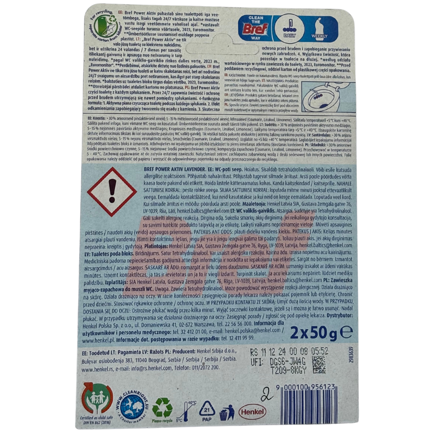 Освіжувач унітазу Bref Power Activ Lawenda - гігієнічний засіб, що очищує та освіжає унітаз під час кожного змивання. Активні компоненти допомагають боротися з брудом, нальотом і бактеріями на стінках унітазу та зменшують їх повторну появу. Освіжувач має приємний аромат лаванди, який усуває неприємні запахи й наповнює приміщення свіжим запахом.