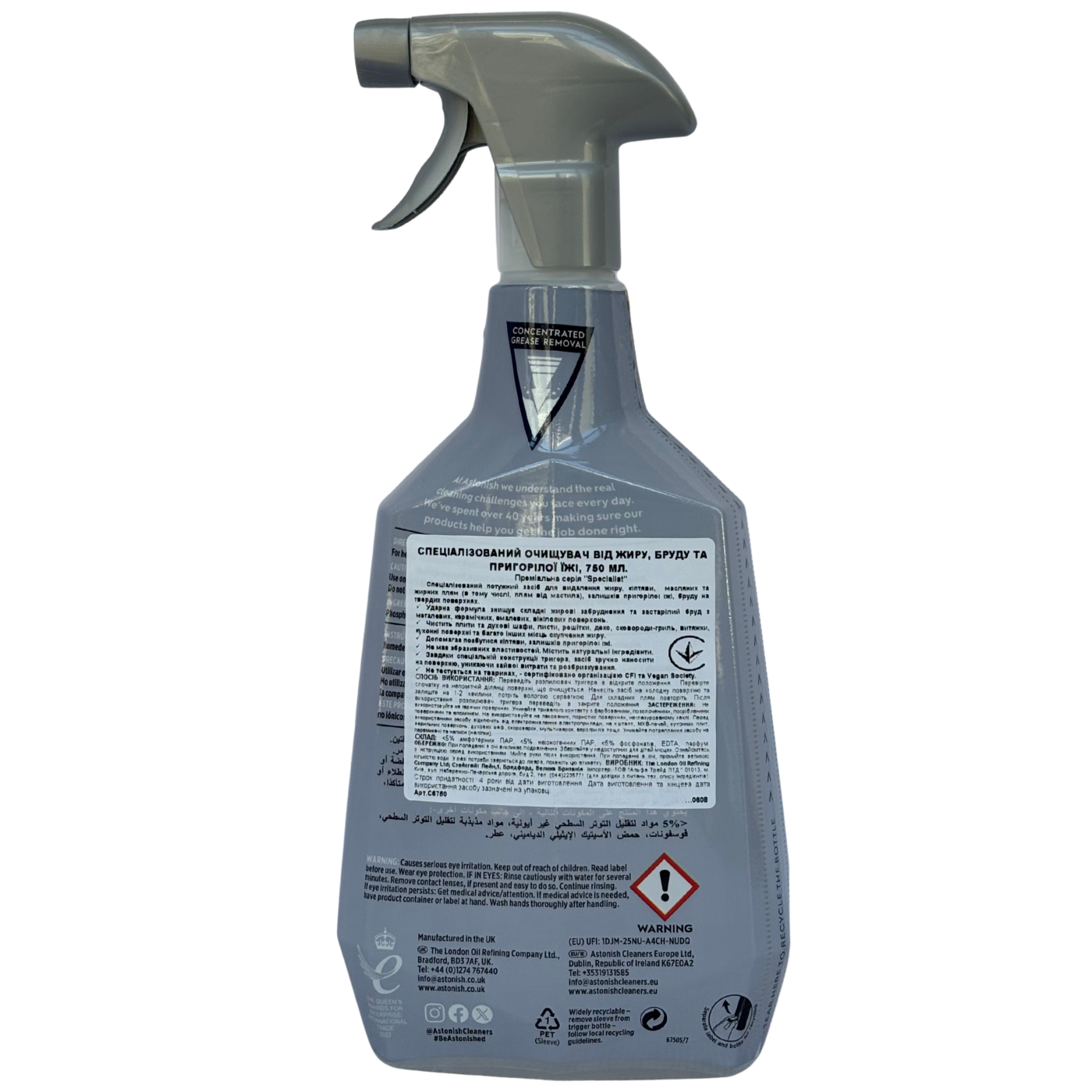 Спеціалізований очищувач від жиру, бруду та нагару. Засіб знищує складні жирові відкладення та застарілий жир з металевих, керамічних, емалевих та вінілових поверхонь. Також підходить для миття плит, грилів, духових шаф та сковорідок. Містить натуральні інгредієнти.