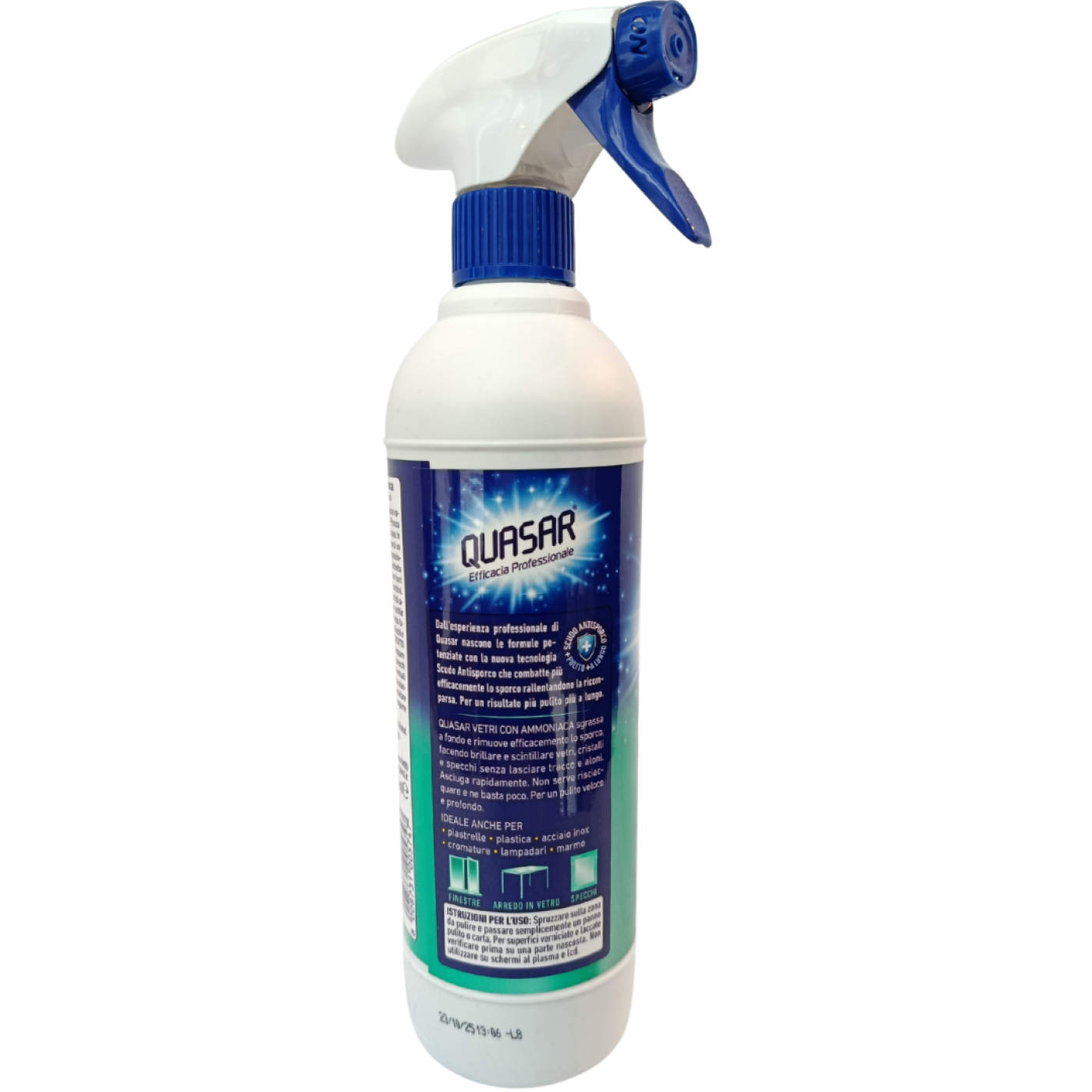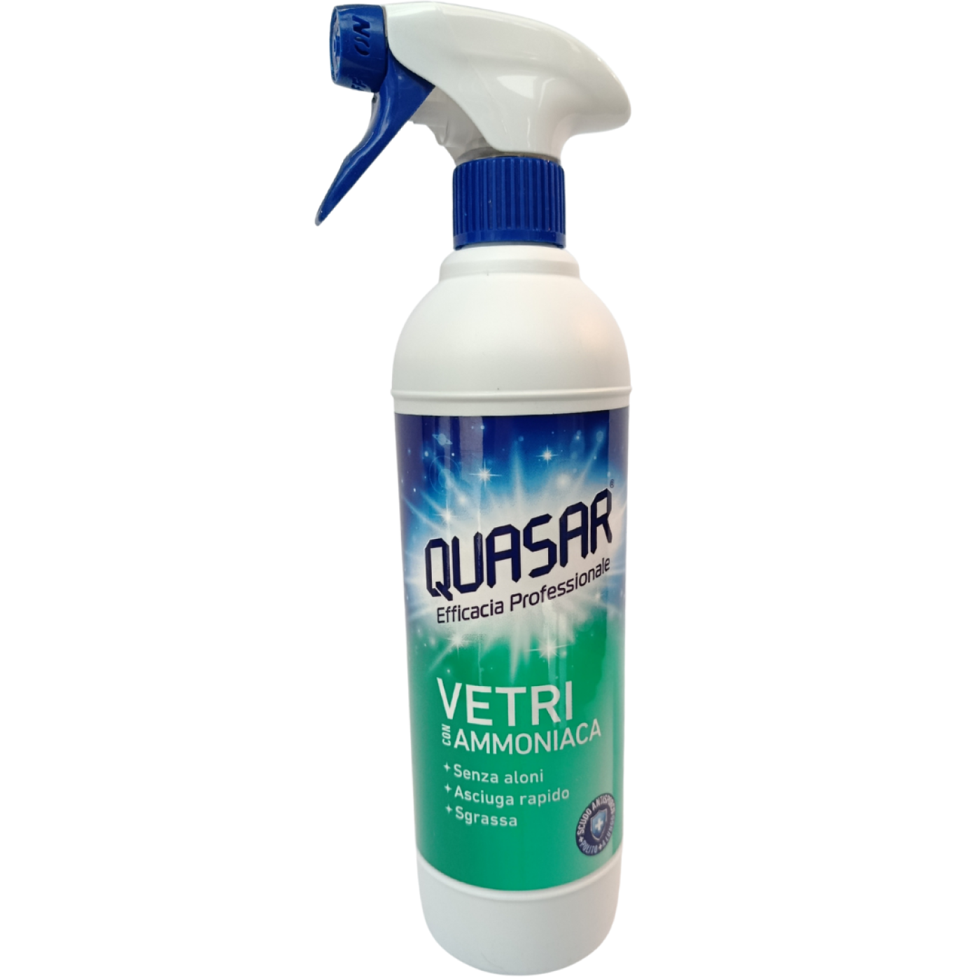 Засіб для миття скляних і дзеркальних поверхонь у спреї з аміаком Quasar Vetri Ammoniaca ефективно видаляє бруд, розводи та відбитки пальців, залишаючи скло та дзеркала чистими та блискучими. Його спеціальна формула швидко очищує поверхні, забезпечує бездоганний результат і полегшує щоденне прибирання дому чи офісу.