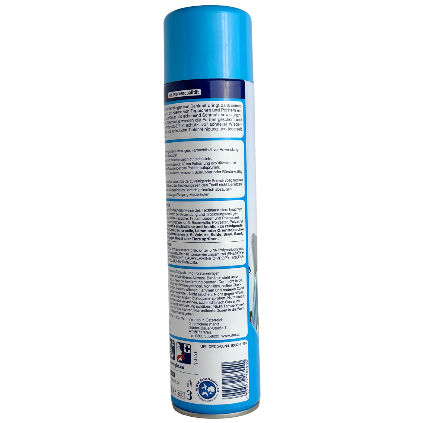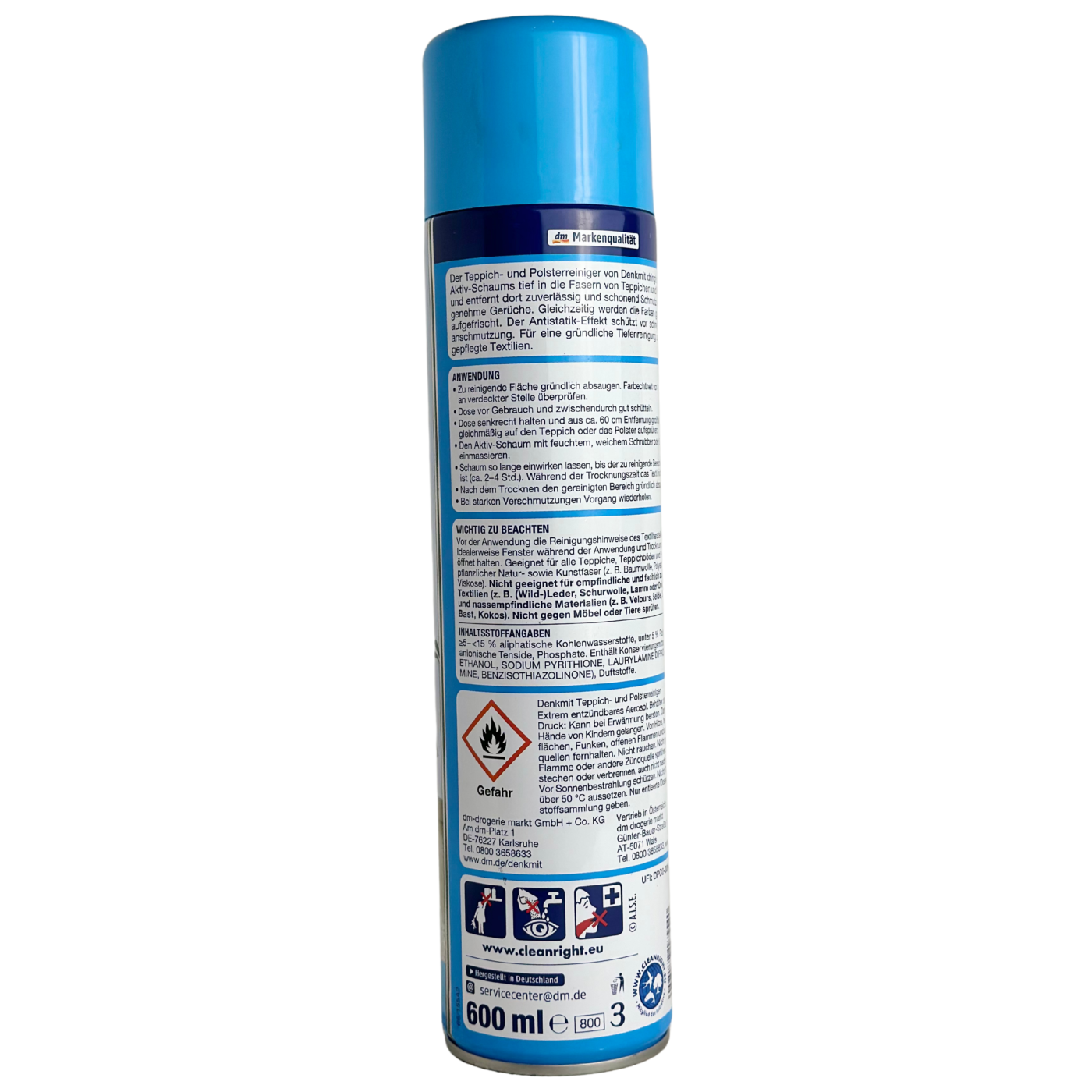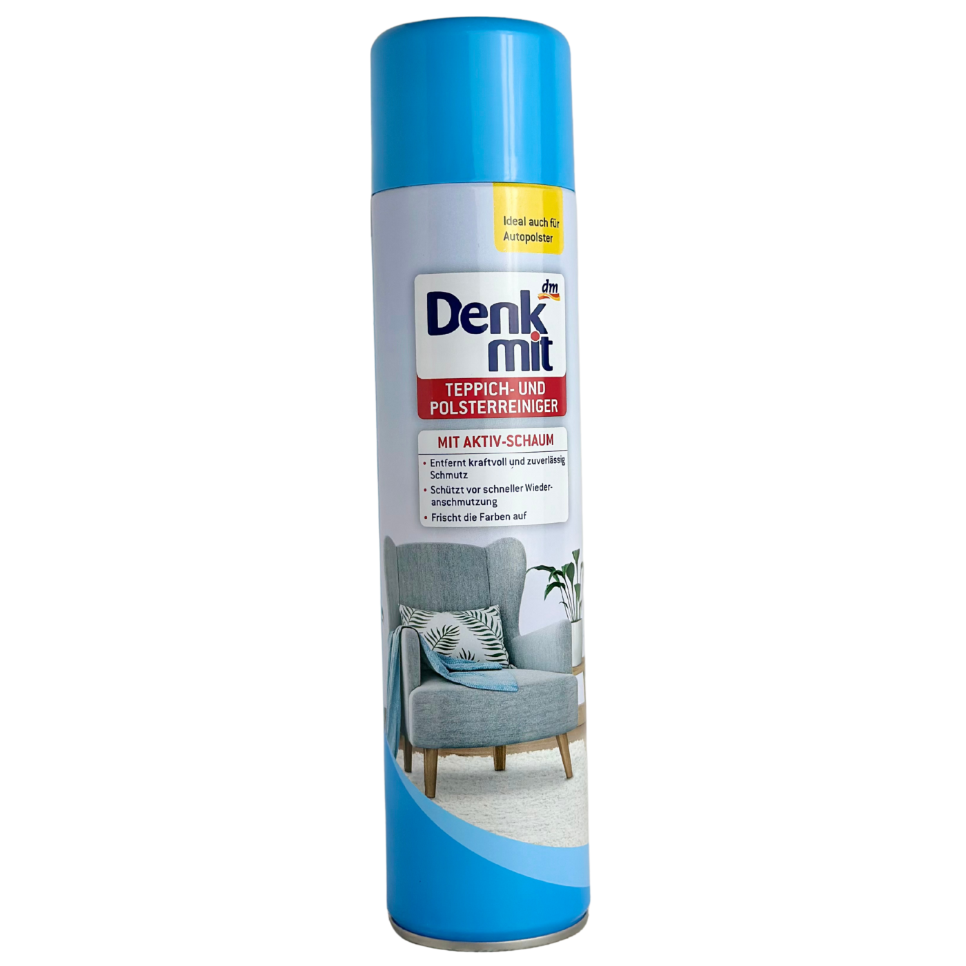 Denkmit tepplich-und-polsterreiniger – ефективний очищувач килимів та оббивки м’яких меблів і салону автомобіля, який позбуває бруду і неприємного запаху. Він має вигляд піни, яка проникає в глибину волокон, видаляє бруд, захищає та зберігає колір. Це чудовий засіб, з яким легко зберігати чистоту, а ще він має антистатичний ефект.