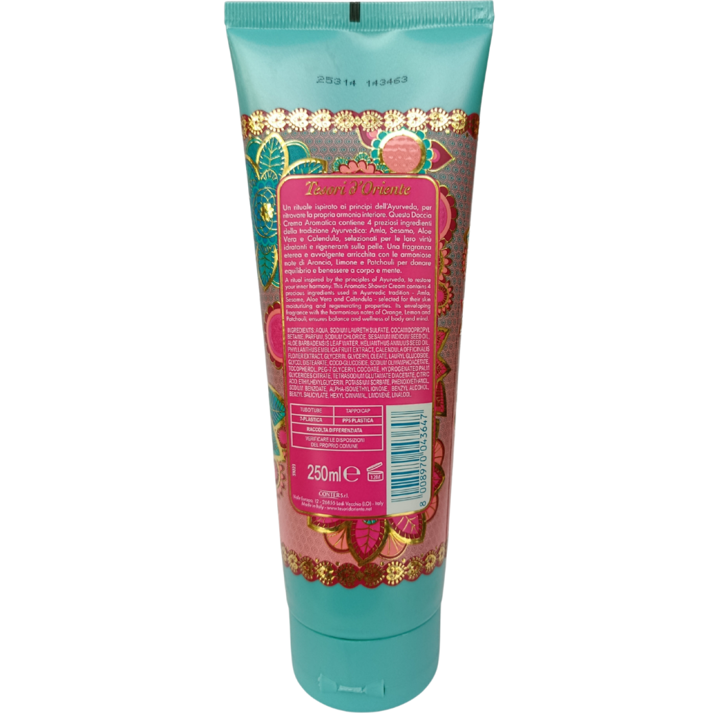 Ayurveda Tesori d’Oriente – надзвичайно ароматний крем-гель для душу, натхненний принципами Аюрведа – традиційної давньоіндійської системи народної медицини. В його складі містяться особливі інгредієнти, які використовують в аюрведичній практиці: ефірна олія Амла та Німа, кунжутна олія, екстракт календули і сік алое, що означає відмінний захист та надзвичайне зволоження. В ароматі ви відчуєте також насичену нотку пачулі, яка довго тримається на шкірі.