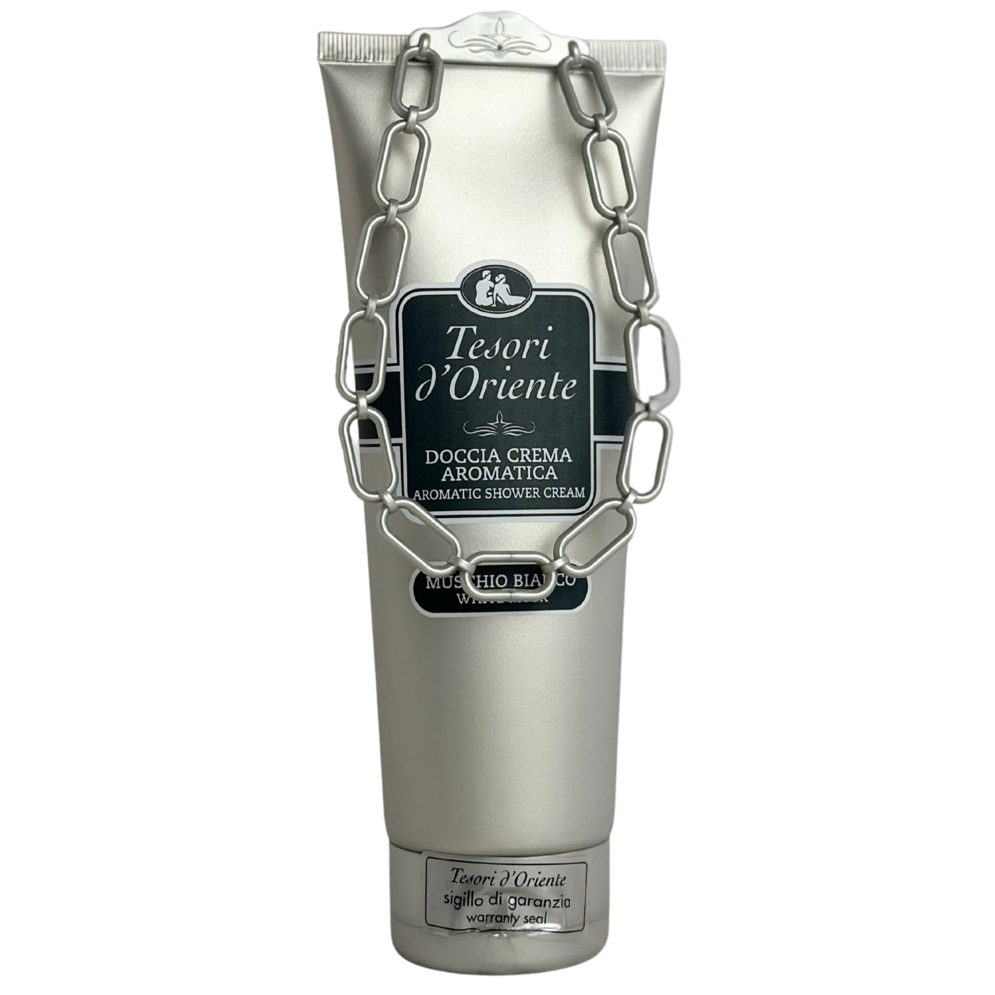 Muschio Bianco Tesori d’Oriente – парфумований крем-гель для душу з насиченим солодкуватим ароматом, який м’яко очищає шкіру, живить її та не пересушує. В його складі містяться ефірні олії, які чудово тонізують, освіжають та дарують приємні емоції. Гель для душу Білий мускус однозначно зробить щоденну процедуру гігієни ще більш приємною та ароматною. Важливо, що в складі відсутні барвники, мінеральна олія і силікони.