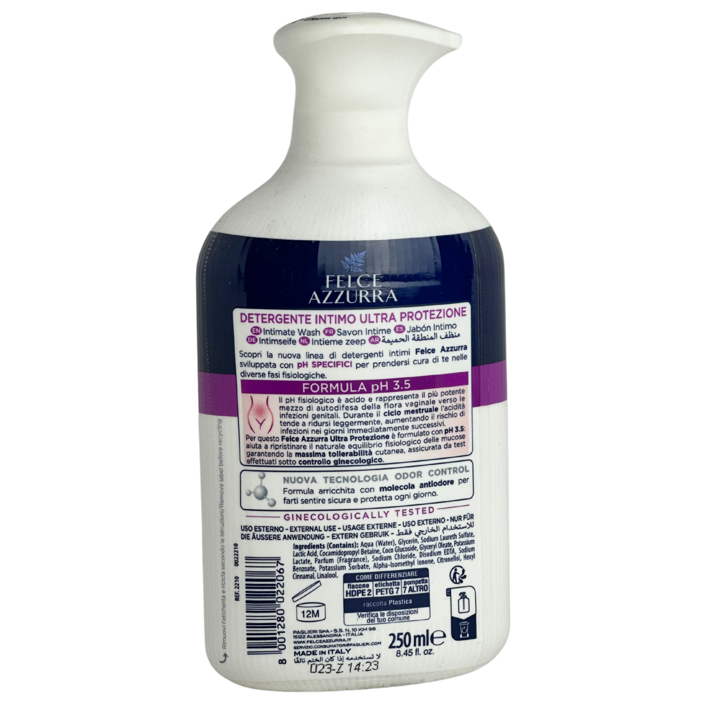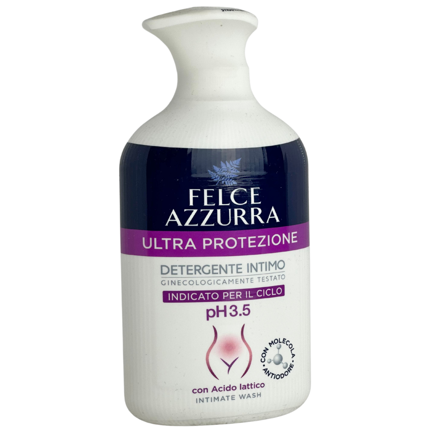 Ultra protezione Felce Azzurra – гель для інтимної гігієни Ультра захист, який ідеально підходить для використання в період менструального циклу. Його формула розроблена з рівнем pH 3,5 спеціально для того, аби зберігати природній баланс слизової під час «цих» днів. Гель дарує свіжість надовго та чудово захищає. В його складі є спеціальна молекула, яка здатна нейтралізувати неприємний запах.