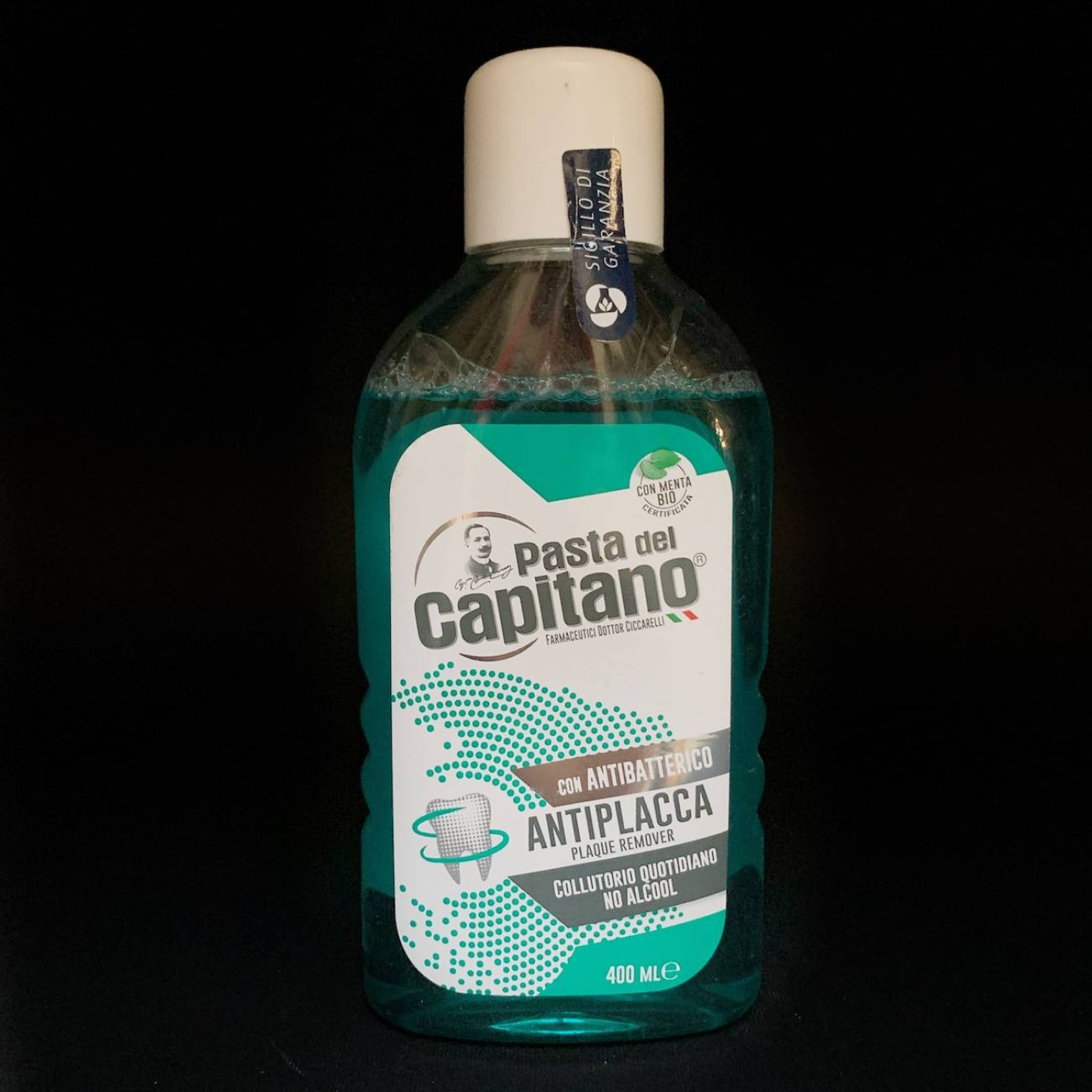 Pasta del Capitano con Antibatterico – якісний італійський ополіскувач для ротової порожнини, який видаляє та попереджає появу зубного нальоту і утворення зубного каменю, забезпечує свіжість і допомагає зберегти білизну зубів. В складі міститься сертифікована біо м’ята, яка заспокоює і чудово освіжає подих.