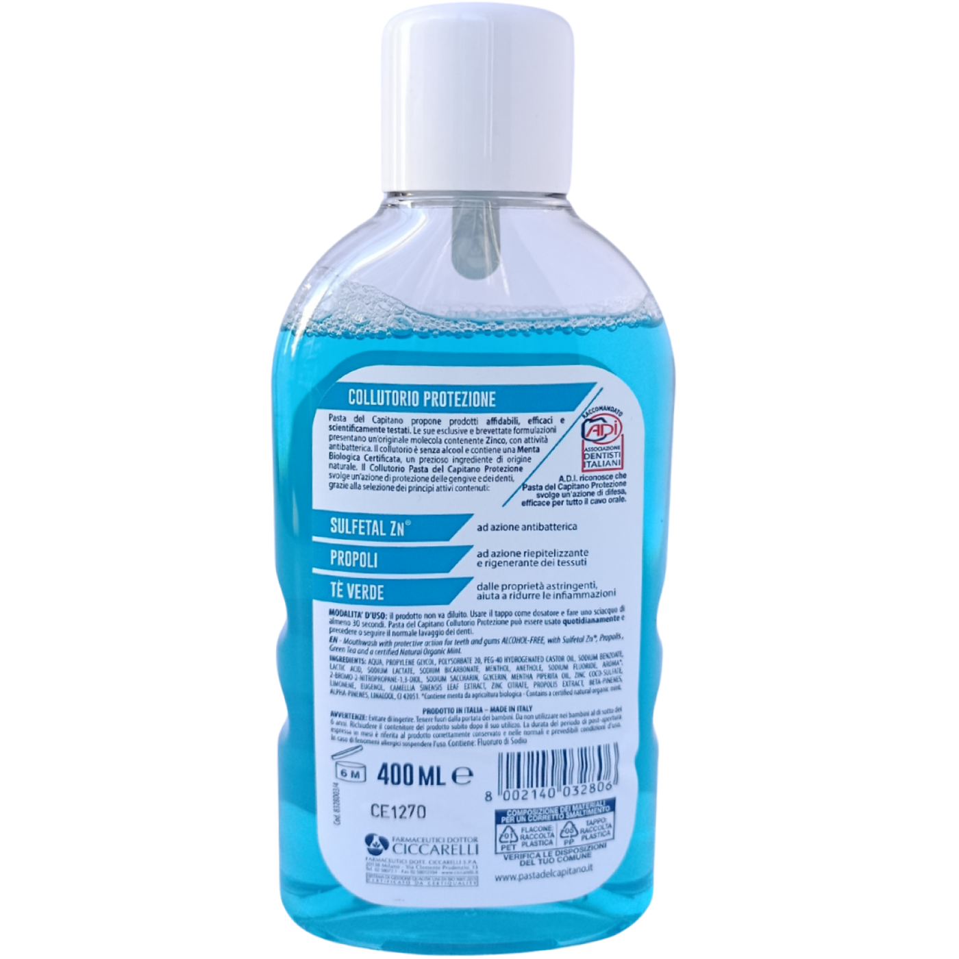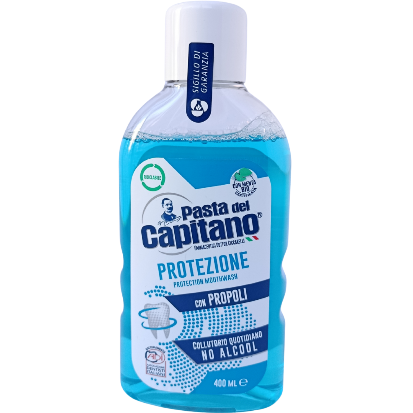 Protezione con Propoli Pasta del Capitano – ополіскувач для ротової порожнини з прополісом, цинком і фторидом, які захищають емаль та ясна і сприяють зменшенню запалення. В складі також містяться зелений чай і натуральна органічна м’ята, які знищують бактерії і освіжають подих. Ополіскувач відмінно підходить для регулярного використання. Не містить спирту. Не рекомендується дітям до 6 років.