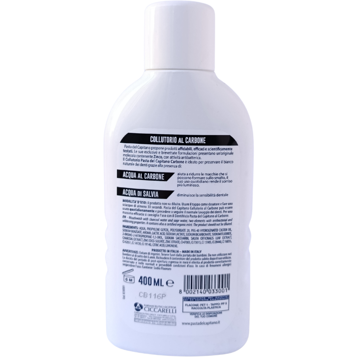 Ополіскувач ротової порожнини з водою шалфії та вугільної води con Acqua di Salvia Pasta del Capitano Carbone 400ml