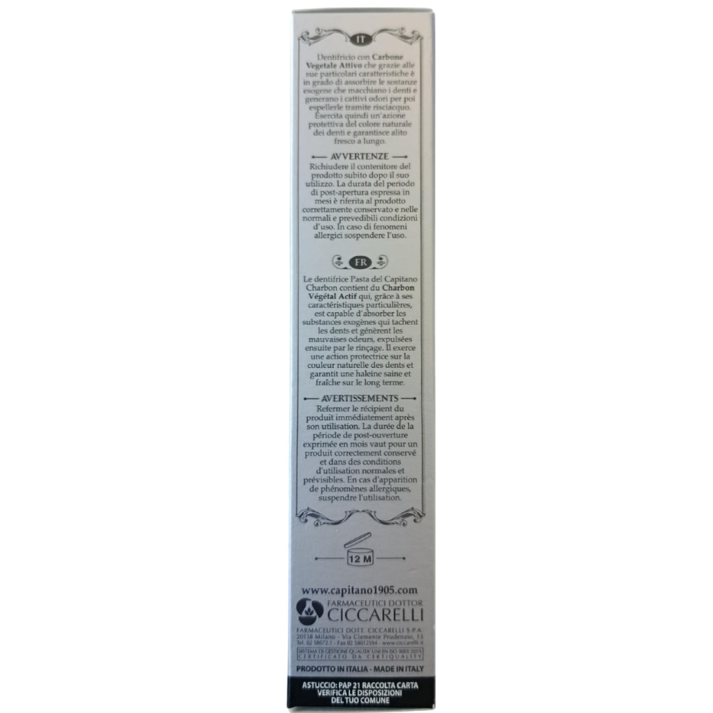 Зубна паста Carbone Pasta del Capitano - унікальна чорна паста з активованим вугіллям, яка дбайливо очищає зуби від нальоту та поверхневих плям, сприяє збереженню природної білизни емалі та підтримує свіжий подих. Формула забезпечує щоденний ефективний догляд за ротовою порожниною, роблячи чистку зубів приємною та результативною.