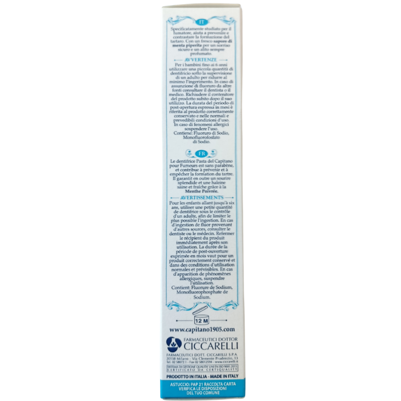 Зубна паста Smokers Pasta del Capitano - спеціально розроблена для людей, які курять. Вона ефективно очищає зуби, допомагає усувати наліт та пігментацію, що виникає через тютюн, доглядає за емаллю і сприяє підтримці гігієни порожнини рота. Формула пасти також сприяє освіженню подиху, роблячи щоденний догляд за зубами більш комфортним.