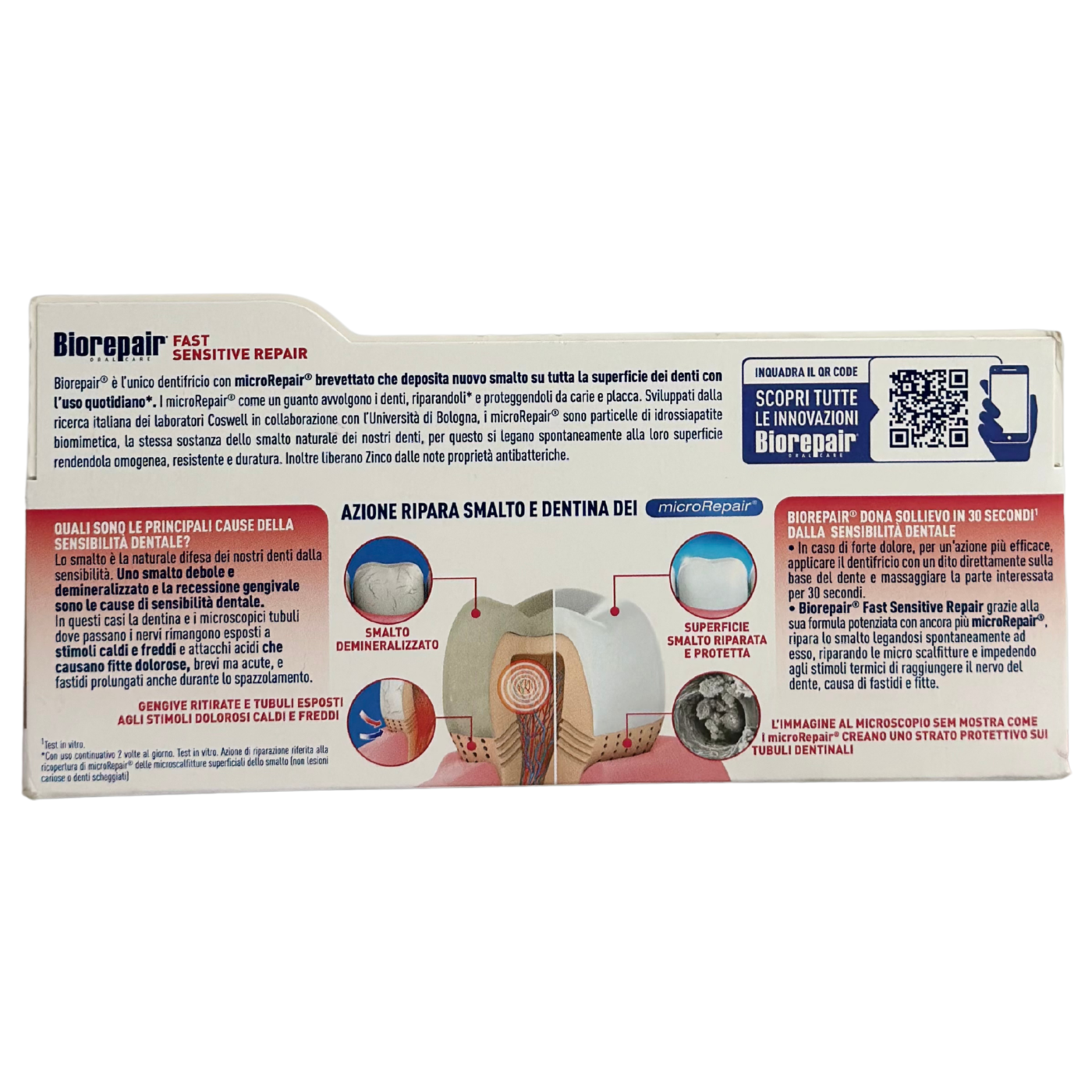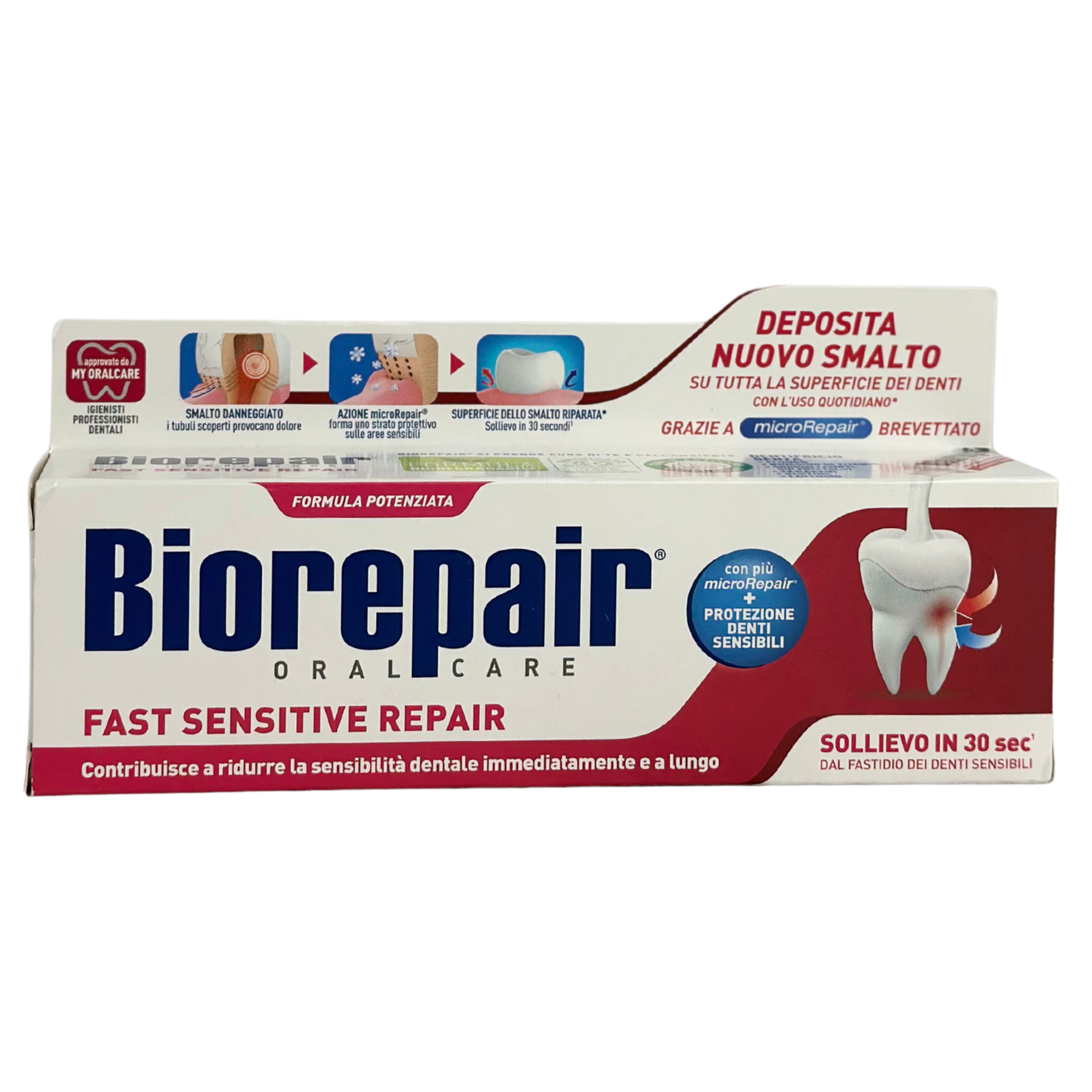 Якісна гігієна зубів можлива і вдома з пастою Fast Sensitive Repair Biorepair, яка стане знахідкою для усіх, хто має проблему чутливих зубів. Вона ефективно зміцнює зубну емаль та знижує чутливість, тому з нею можна забути про неприємні та болісні відчуття під час споживання холодної та гарячої їжі або напоїв. Унікальна формула пасти містить спеціальні речовини, які заповнюють мікротріщини на поверхні, а також утворюють захисну «плівку».