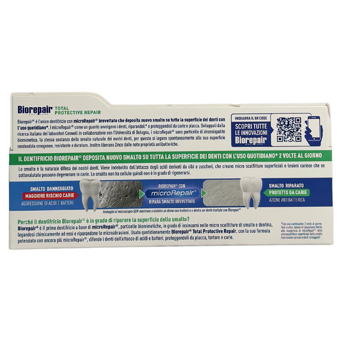 Зубна паста Total Protective Repair Biorepair забезпечує абсолютний захист та відновлення зубів за рахунок комплексного догляду за ротовою порожниною, тому вона ідеально підходить для щоденного використання. Паста особливо ефективна проти бактерій та негативного впливу кислот, також вона захищає від каменю і карієсу. В її складі міститься гідроксіапатит – речовина, схожа на структуру емаль, що забезпечує ремінералізацію та відновлення.