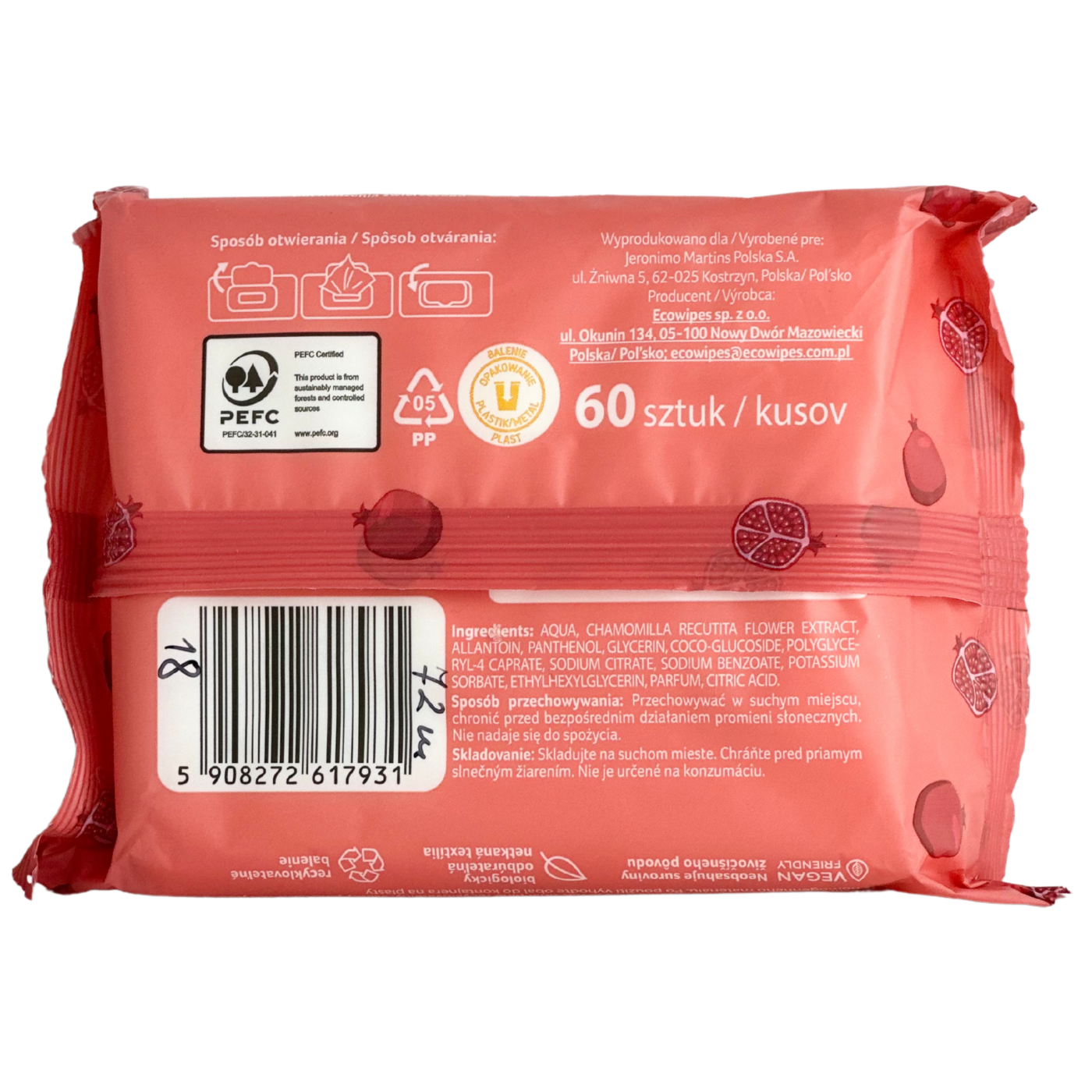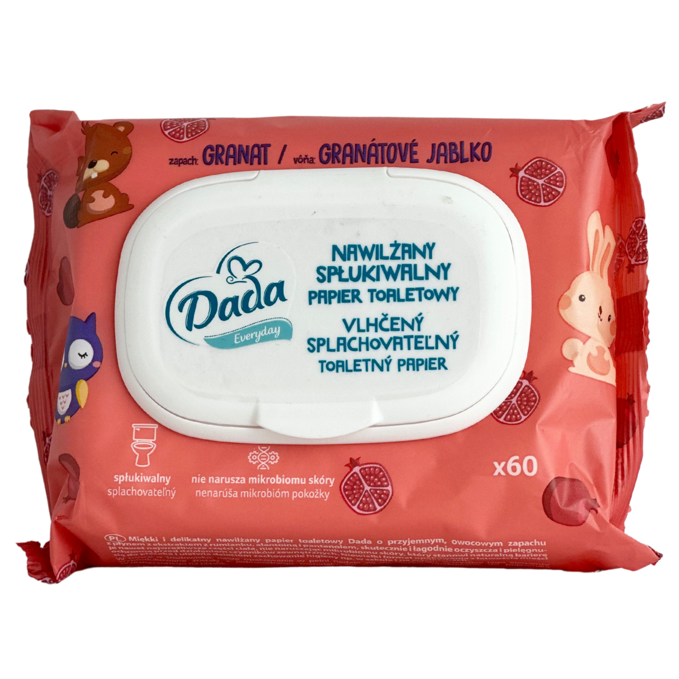 Вологий туалетний папір Dada з ароматом гранату - це ідеальне поєднання делікатного догляду та приємного фруктового аромату. М’яка текстура серветок ніжно очищує, не подразнює шкіру та залишає відчуття свіжості після кожного використання. Підходить для щоденного використання дорослими й дітьми, можна змивати в унітаз - розчиняються у воді.