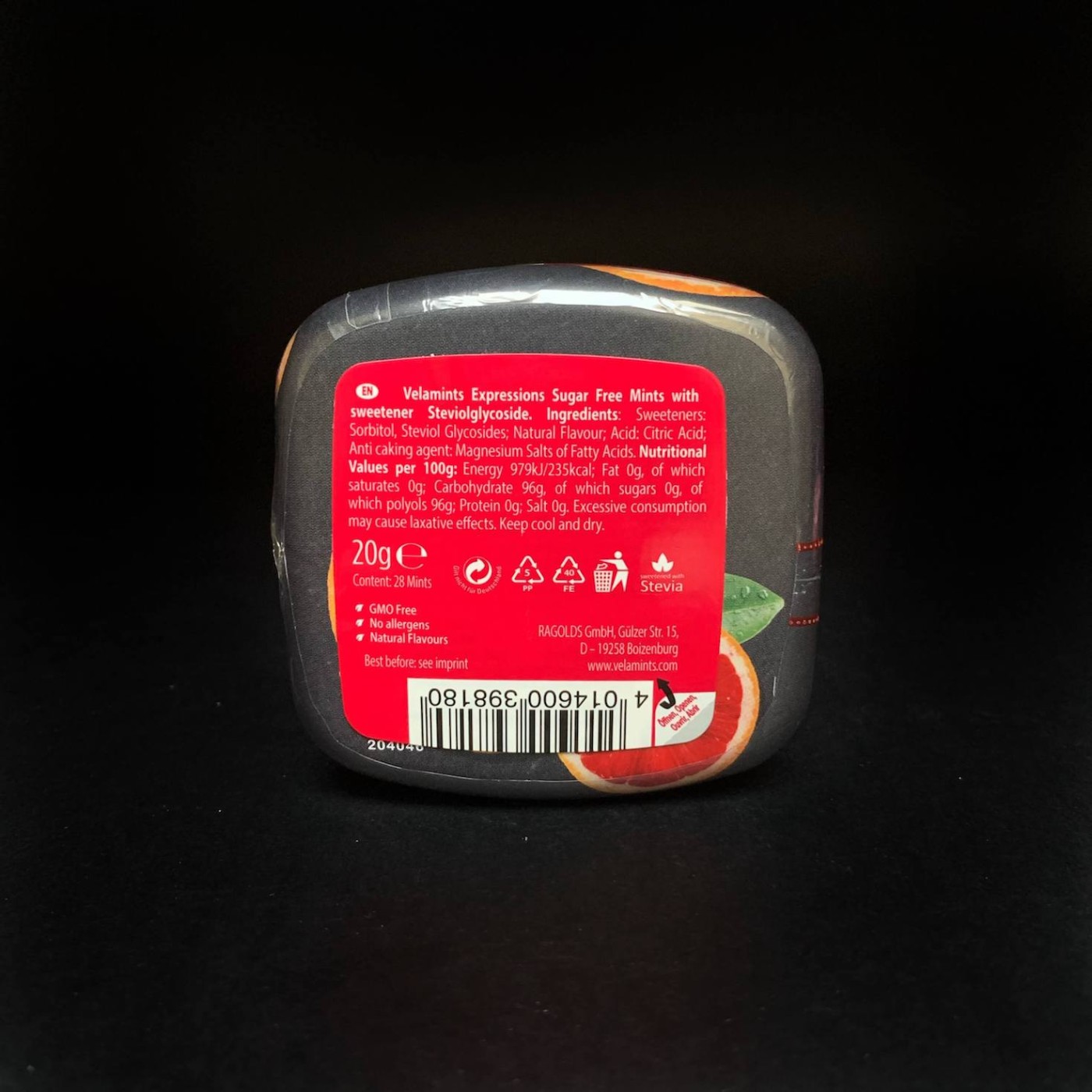 Velamints Blood Orange – чудові освіжаючі драже з м’ятно-апельсиновим смаком, які продаються в стильній металевій упаковці. Вони мають багато переваг, найважливіша – відсутність цукру, замість якого в складі міститься стевія. Це дозволяє споживати продукт усім, хто не вживає цукор. Також в складі немає алергенів, глютену, ГМО і штучних барвників та ароматизаторів.
