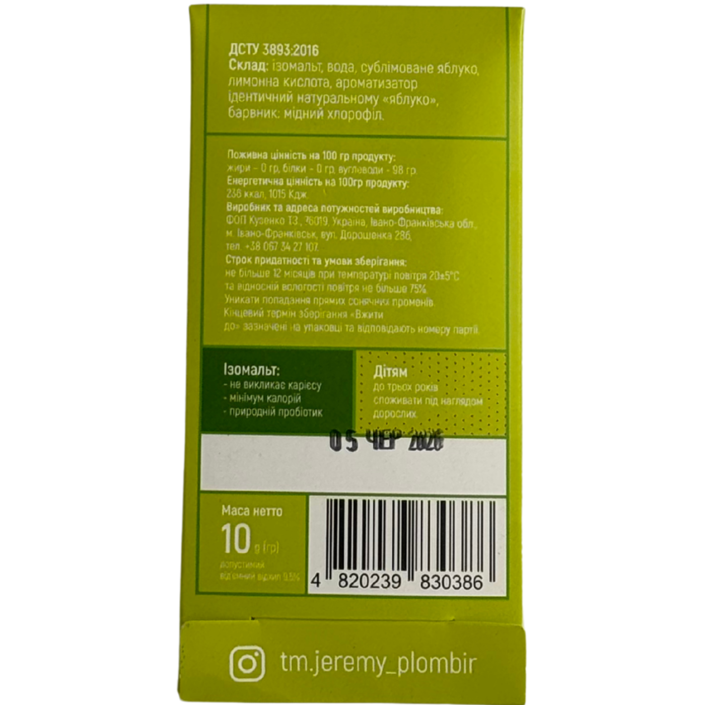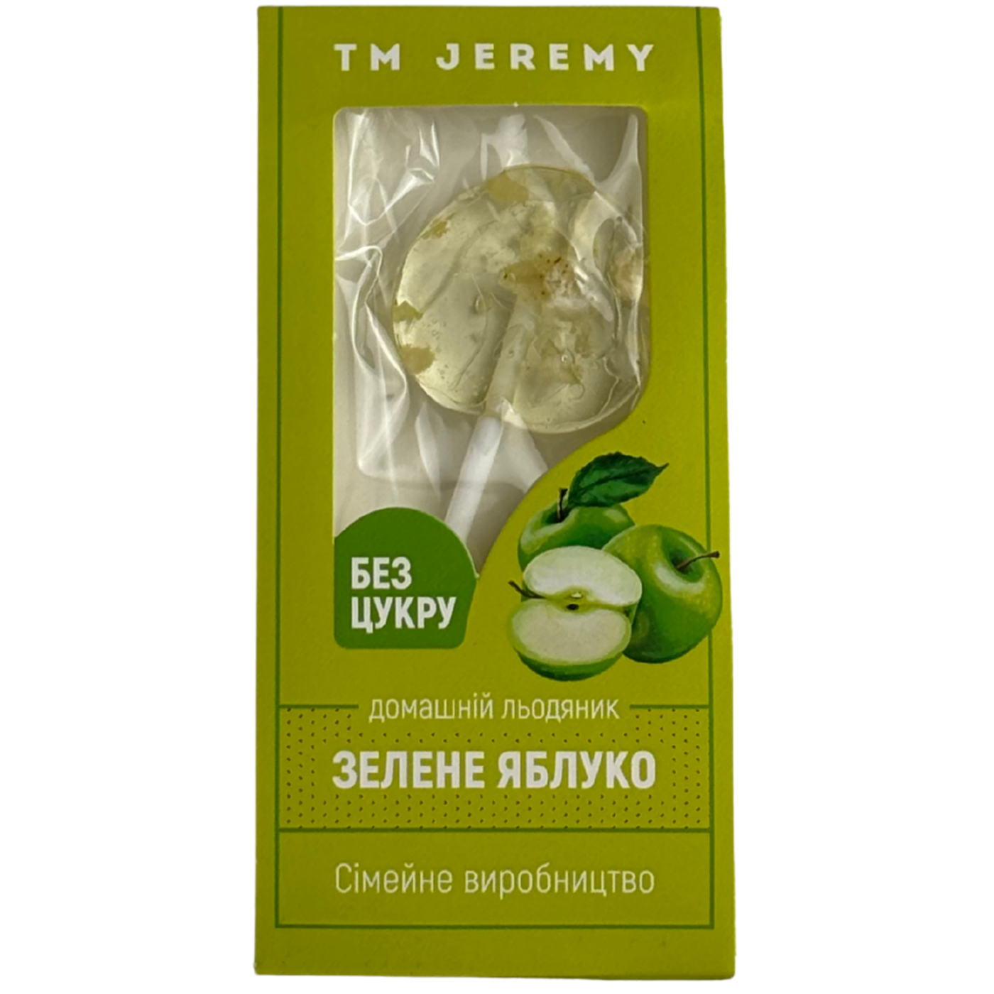 Льодяник без цукру сіменого виробництва ТМ Jeremy з сублімованим зеленим яблуком смакуватиме як малюкам, так і дорослим. В його основі ізомальт - натуральний замінник цукру, тому можна вживати смаколик при діабеті. Виробники використовують палочку зі спеціальною надсічкою, щоб льдяник був не тільки смачним, а й безпечним. Виготовлений з натуральних барвників, в міру солодкий та не викликає карієсу.
