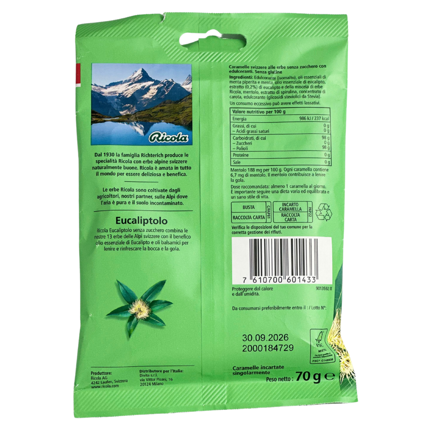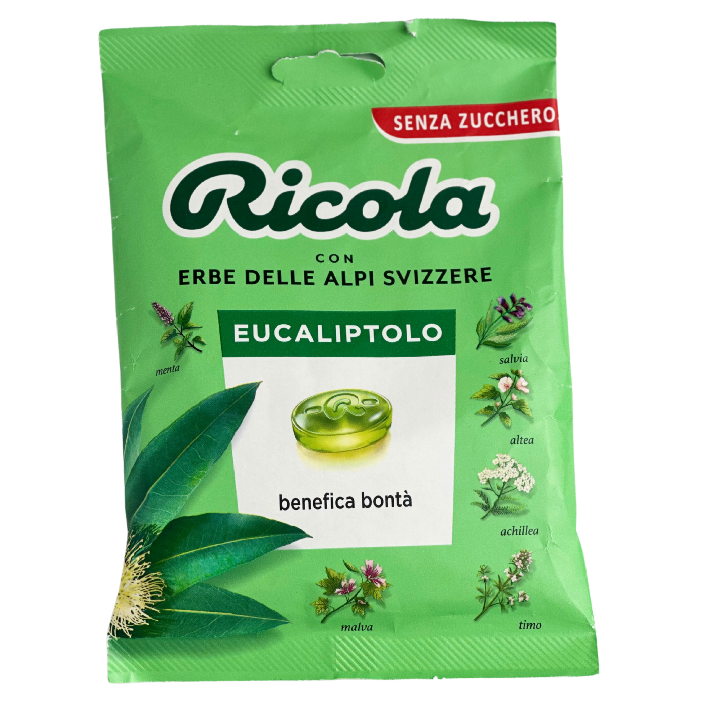 Льодяники Eucaliptolo від швейцарського виробника Ricola містять натуральну суміш 13 трав: шандра, бедринець, вероніка, алтея лікарська, манжетка, бузина (квіти), калачики (мальва), м’ята перцева, шавлія, деревій звичайний, первоцвіт, подорожник та чебрець. Також до них додають екстракт евкаліпту, який чудово освіжить та допоможе при болю в горлі або кашлі. Цукерки Рікола не містять цукру, лактози та глютену, вони виготовлені виключно з натуральних інгредієнтів.