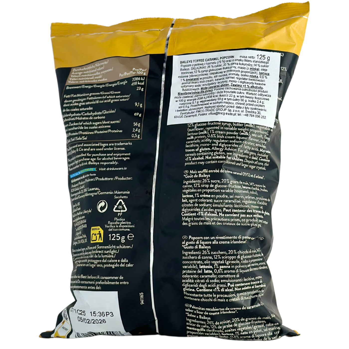 Попкорн Baileys Toffee Caramel — це хрусткий попкорн, щедро вкритий ніжною карамеллю з ароматом ірландського лікеру Baileys. Поєднання солодкого і вершкового смаку створює вишуканий десерт, який ідеально пасує до перегляду фільмів або як оригінальне частування.
