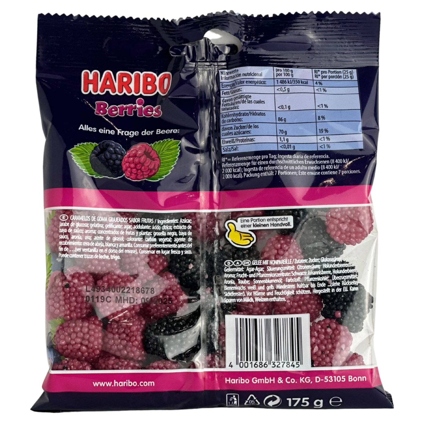 Желейні цукерки Berries Haribo  — це апетитні солодощі у вигляді соковитих ягід малини та ожини, що поєднують ніжну желейну серединку та хрустку оболонку. Вони мають яскравий фруктово-ягідний аромат і дарують справжнє задоволення смаку.