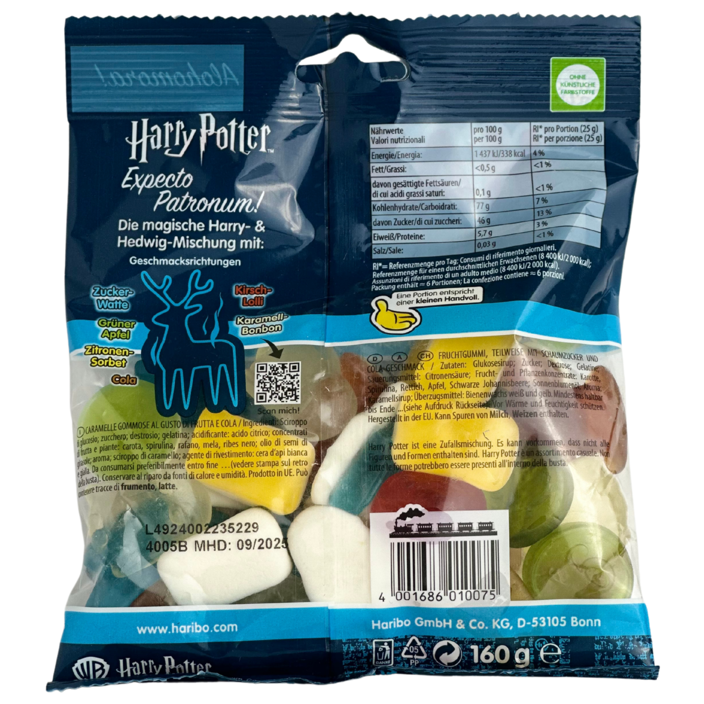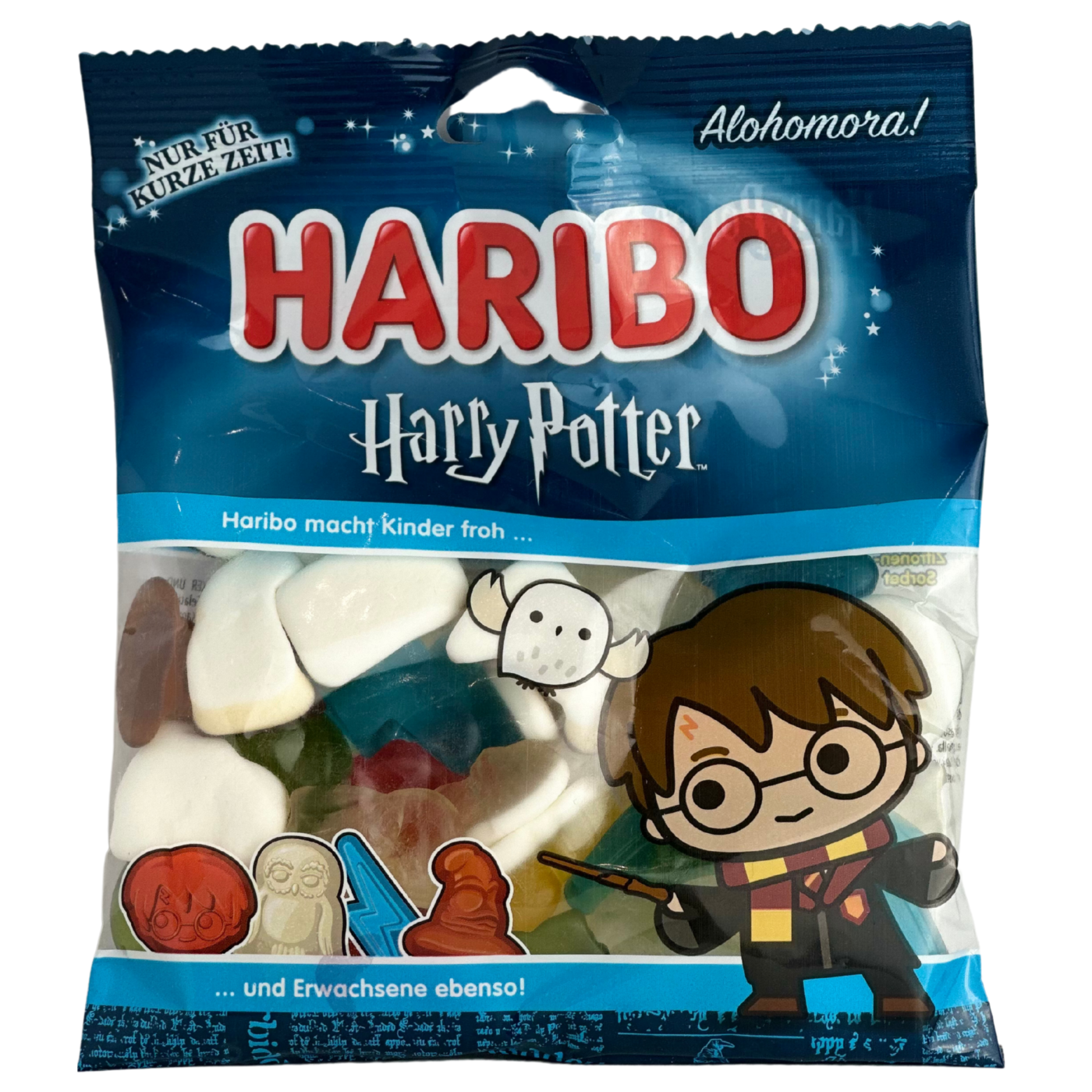 Желейні цукерки Expecto Patronum Harry Potter Haribo 160g — це смачний та чарівний перекус, що поєднує яскраві фруктові смаки з магічною атмосферою світу Гаррі Поттера. Ці желейки мають форми знакових символів, таких як чарівна паличка, платформа 9¾, золотий снітч, сортувальний капелюх, блискавка та сова Гедвіг, що робить їх особливо привабливими для шанувальників серії.
