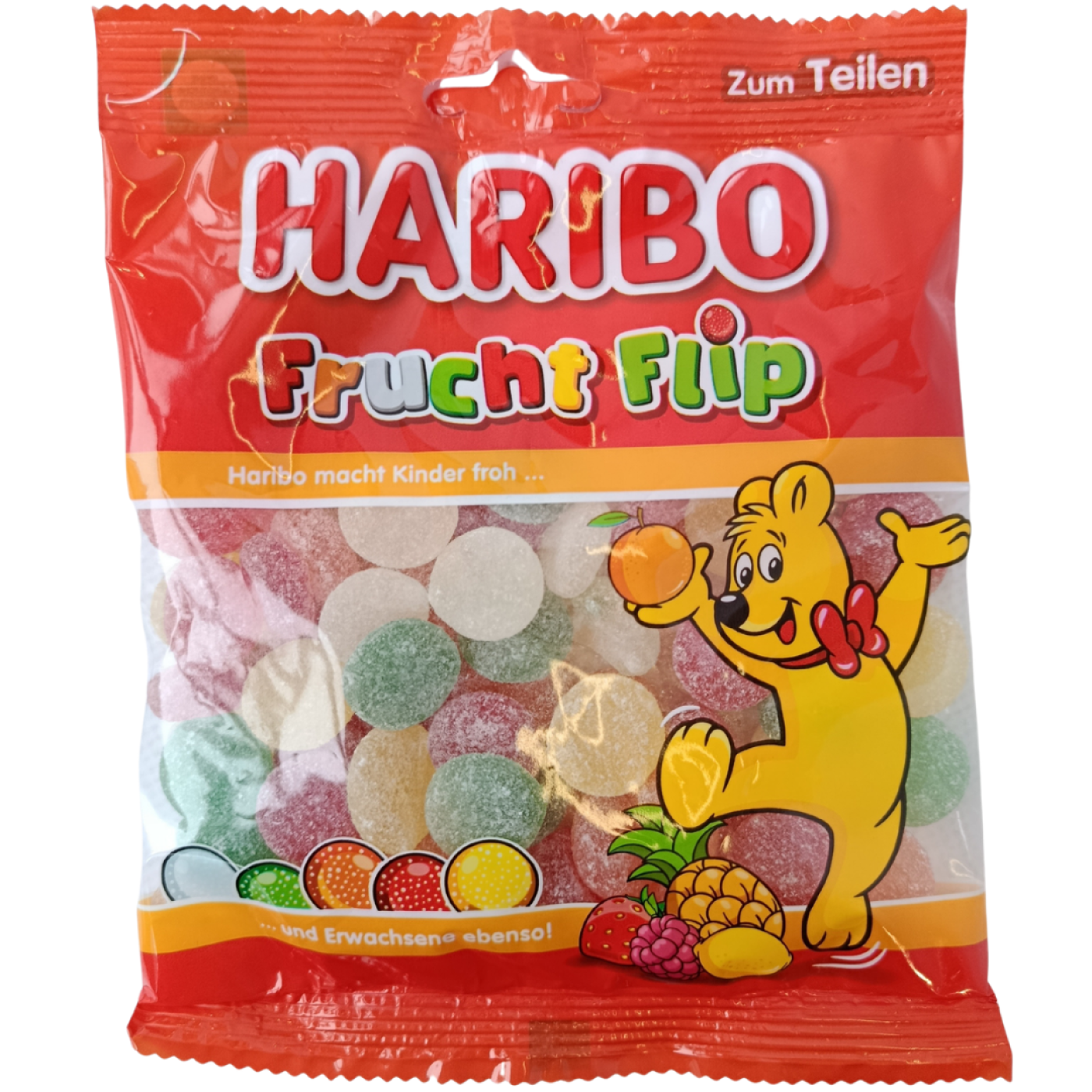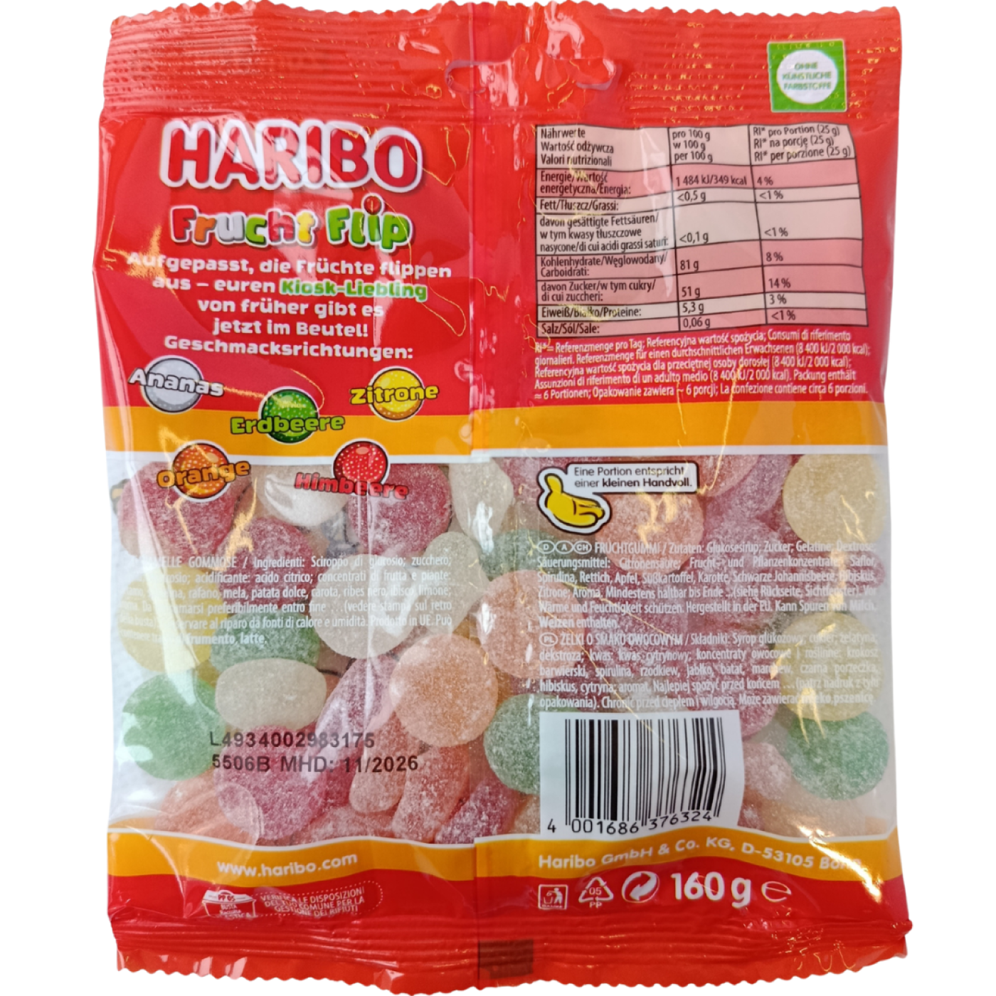 Желейні цукерки Frucht Flip - це асорті желейок, яке включає в себе найпопулярніші фруктові смаки, такі як лимон, полуниця, апельсин, малина та ананас. Чудово смакуватимуть як перекус в дорозі, на роботі чи в школі. Зруче пакування дозволяє брати цукерки з собою. Виробники використовують лише натуральні інгредієнти. В складі немає штучних барвників, ароматизаторів та консервантів.