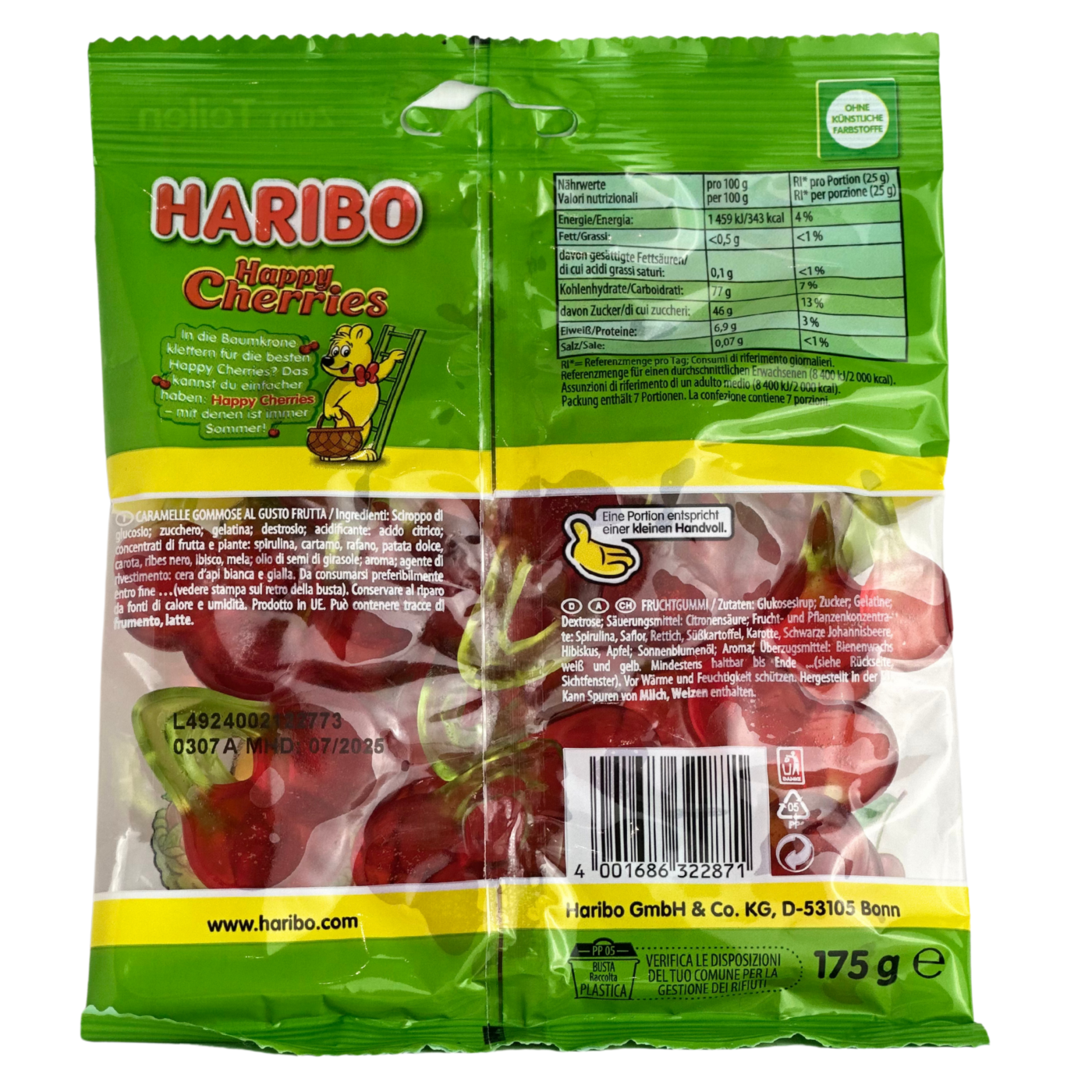 Желейні цукерки Haribo Happy Cherries - це моно-смаковий продукт, який пропонує насолоду насиченим та натуральним вишневим смаком у формі яскравих вишеньок. Вони мають м'яку, еластичну текстуру і не містять штучних барвників