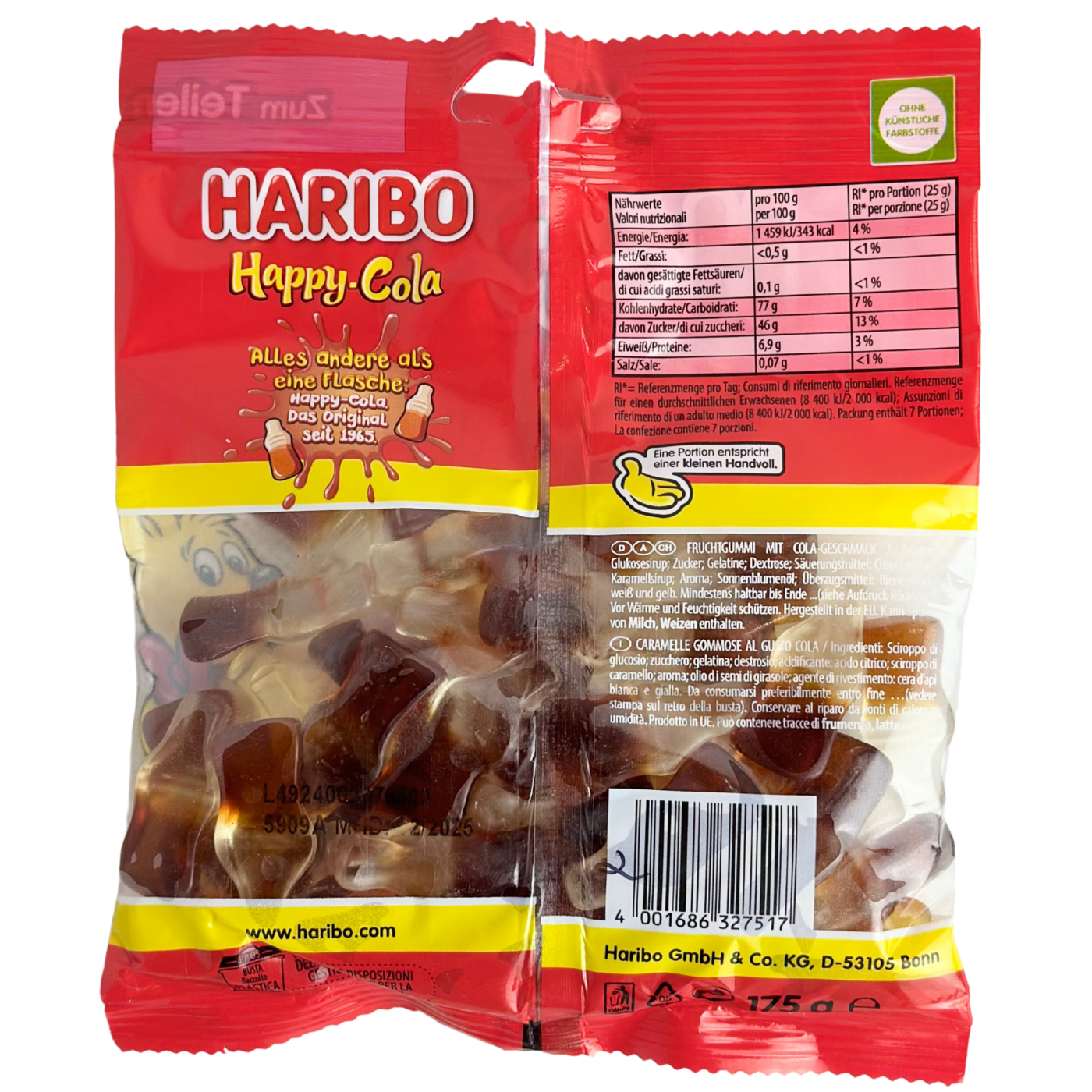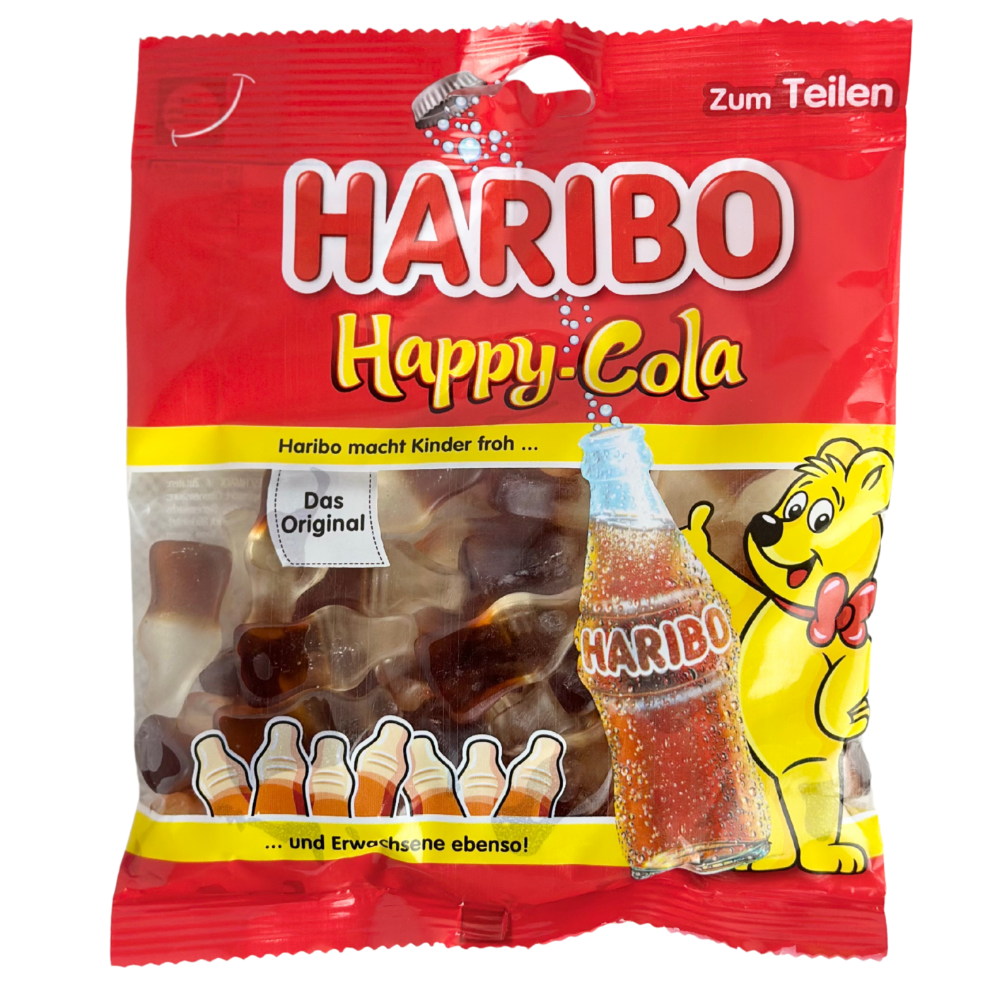 Желейні цукерки Happy Cola створені в милій формі скляної пляшки газованої води та створений на смак вашої улюбленої коли. Haribo Happy Cola є одним із найпопулярніших продуктів Haribo у всьому світі. Вони відмінно підходять для тих, хто любить солодке і хоче насолодитися оригінальним смаком колиу формі цукерки. Вони навіть мають шипучий смак. Наповнені насиченим смаком коли, ці желейки неодмінно порадують ваші смакові рецептори.