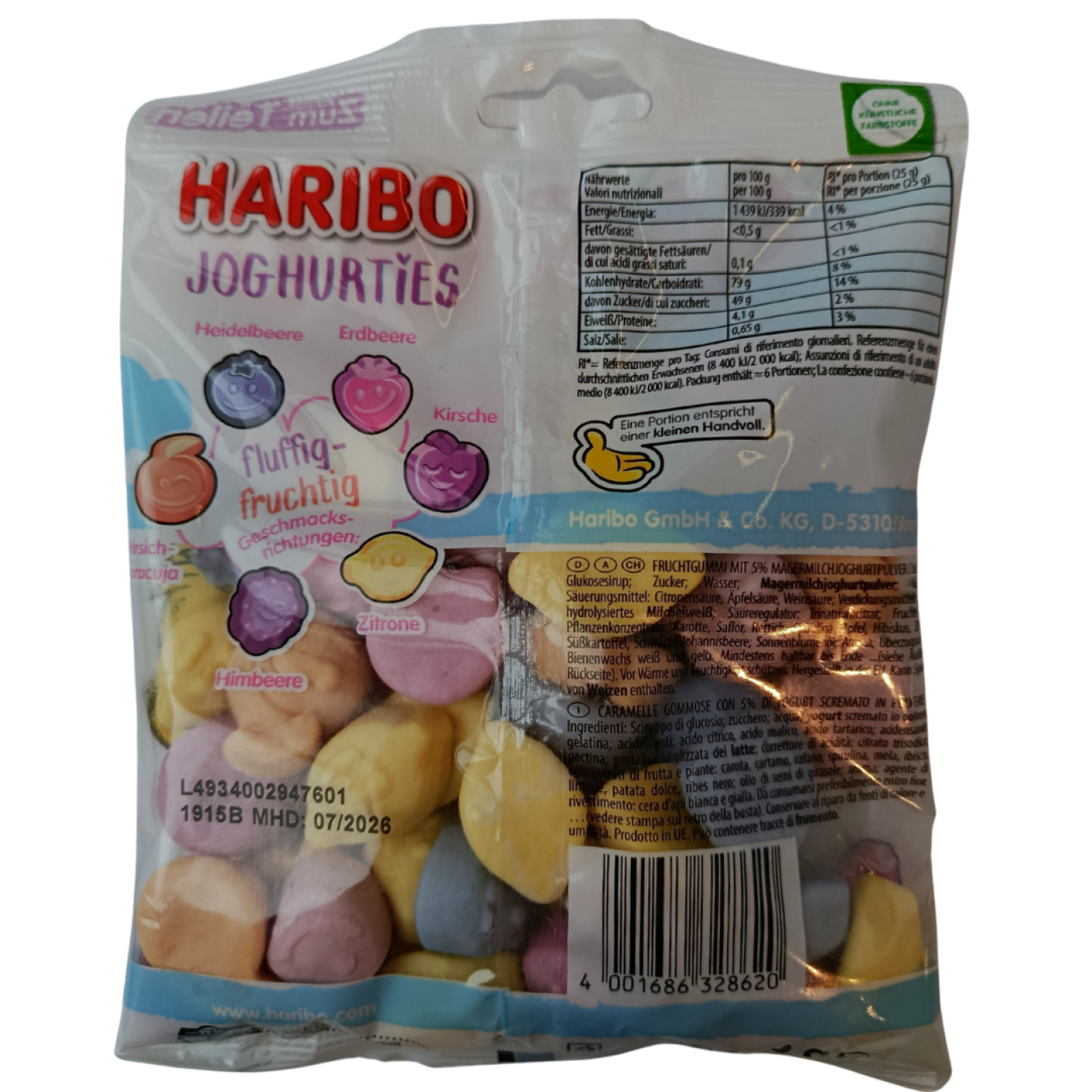 Насолоджуйтеся 5 фруктовими смаками у желейних цукерках Joghurtie. Чорниця, полуниця, вишня, лимон, малина і персик-маракуйя припадуть до смаку кожному ласуну. Маленькі ласощі схожі на зухвалі фрукти зі смішними мордочками так і спокушають, щоб їх з'їсти. Інтенсивна йогуртова нота робить їх особливо освіжаючими та смачними. Вони виготовляються із желе на основі пектину, що робить їх текстуру м'якою та приємною для вживання.