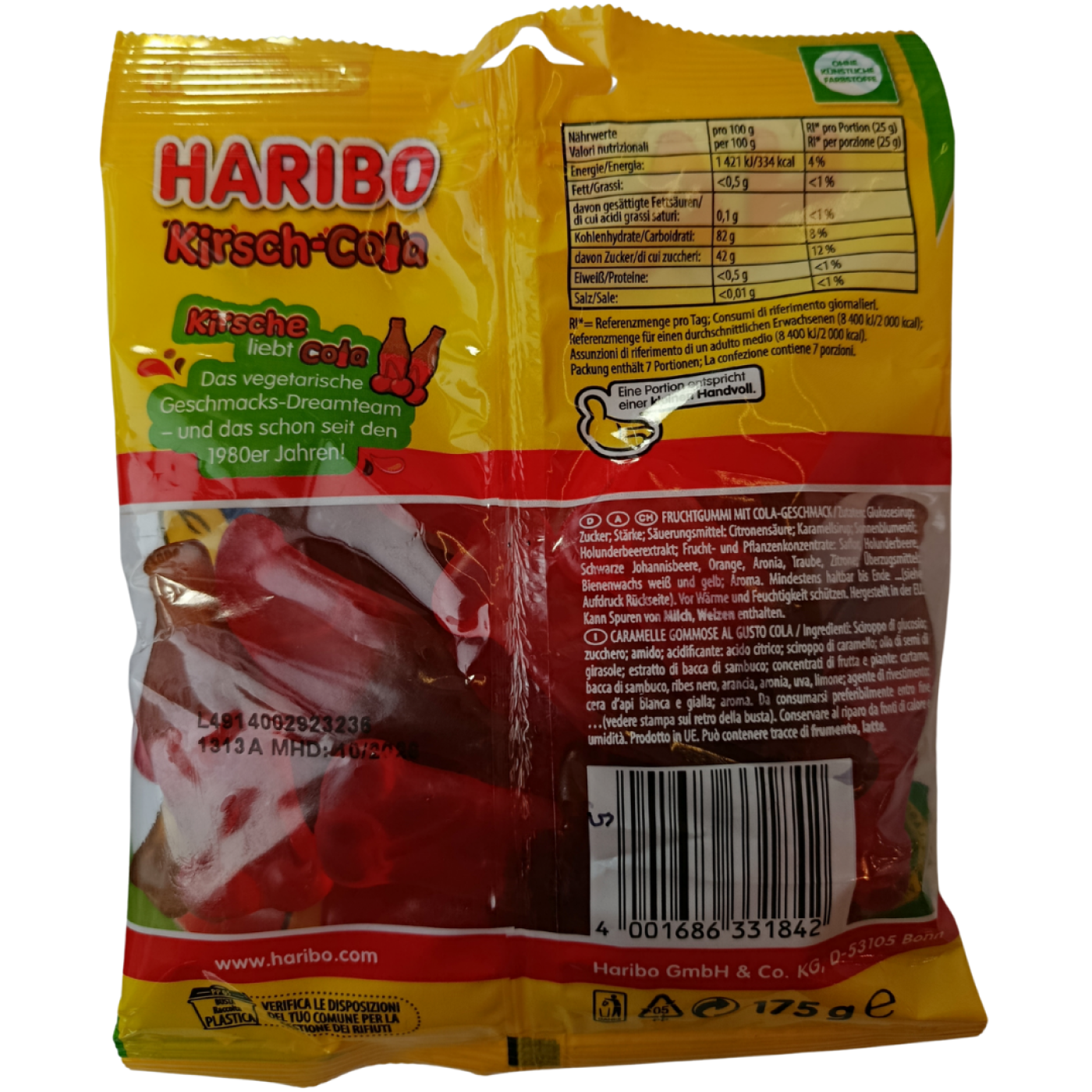 Желейні цукерки Kirsch-cola  - це чудова інтерпретація класичних ретро цукерок з оригінальним смаком коли. Ці маленькі двоколірні пляшки в червоному та коричневому кольорах наповнені солодким і м’яким смаком вишневої коли. Підходить для вегетаріанців.