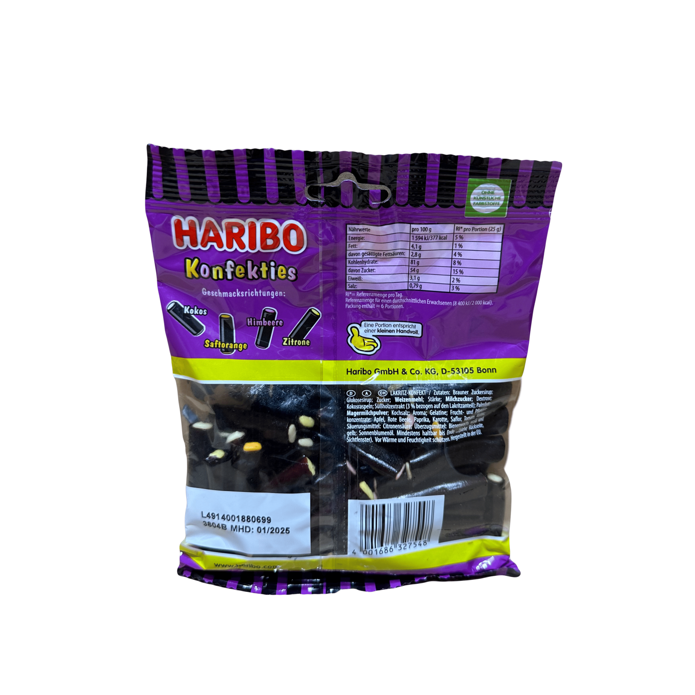 Желейні цукерки Konfekties – це ароматні мармеладки з лакриці з фруктовою начинкою. Мармеладні лакричні трубочки з натуральними смаками: лимона, апельсина, кокоса та малини! Будьте готові насолодитися сплеском яскравого смак. Ці чудові ласощі від Haribo — мрія любителя лакриці. Кожен шматочок має зовнішню оболонку з чорної солодки, наповнену надзвичайно смачною і солодкою серединою, що створює ідеальний баланс насиченого смаку та непереборної солодкості в кожному шматку. Це чудова нагода потішити себе.