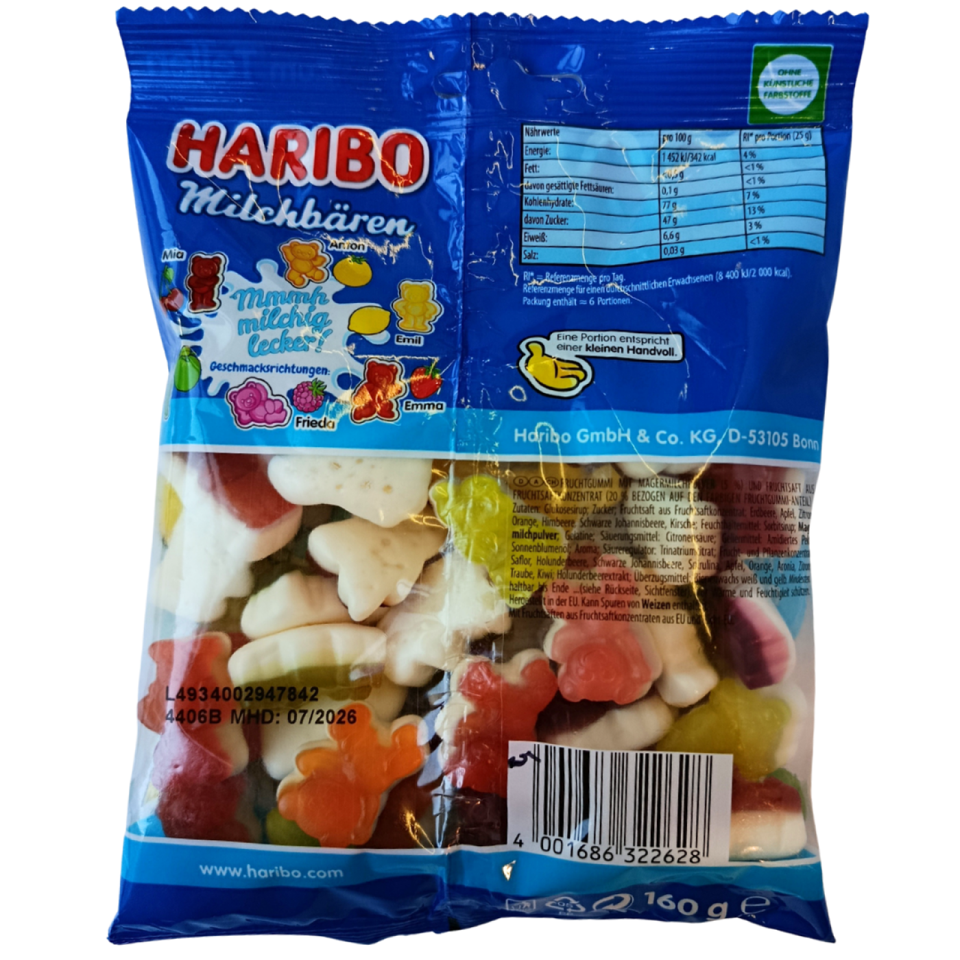 Желейні цукерки Milchbären Haribo 160 г — це ніжні жувальні ведмедики з м’яким молочним смаком, які просто тануть у роті. Поєднання фруктових нот і вершкової м’якості робить їх улюбленими як у дітей, так і в дорослих. Яскраві, ароматні та приємні на текстуру, вони ідеально підходять для солодкого перекусу, чаювання або як маленька радість протягом дня. Класична якість Haribo, якій довіряють.