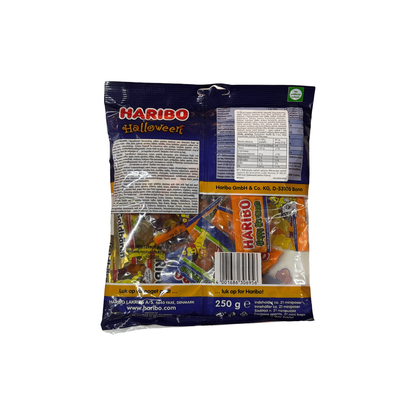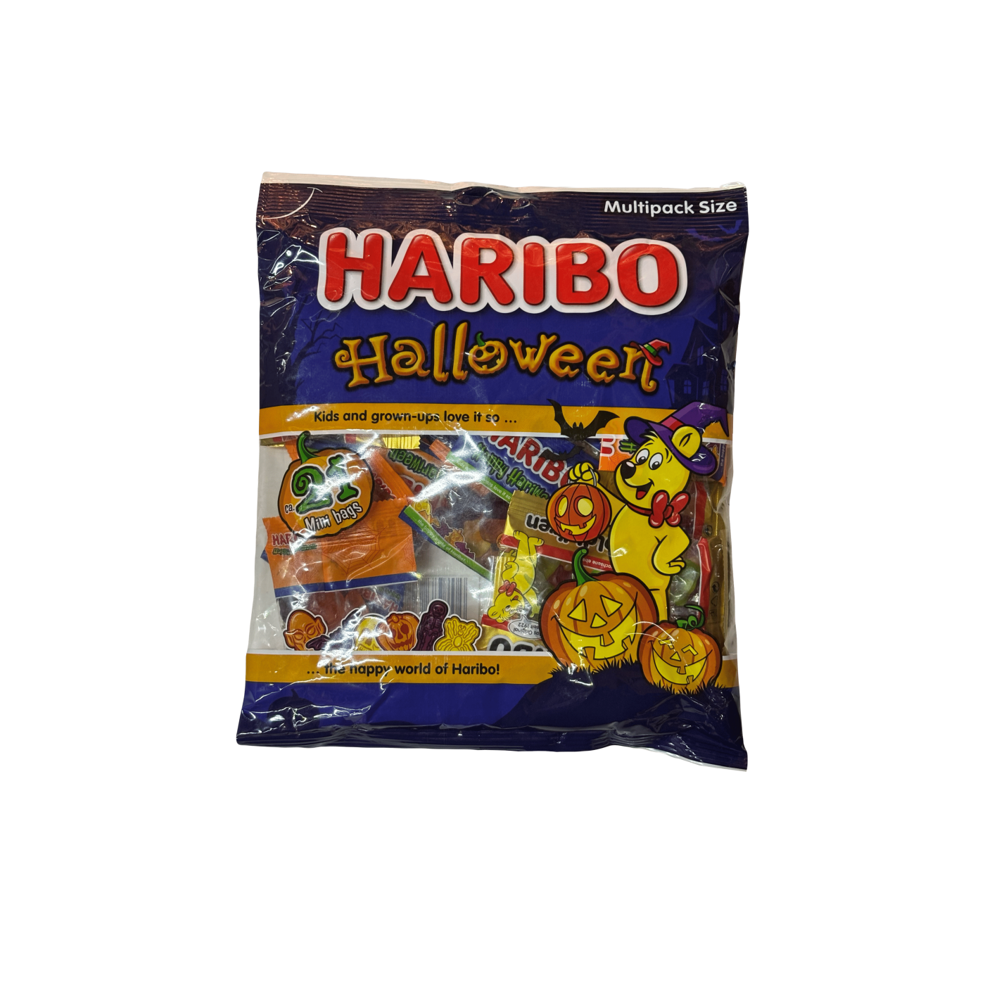 В упаковці Haribo Halloween - величезний мікс желейних цукерок. Усередині 21 міні пакетик з моторошно смачними цукерками: жувальні цукерки у формі привидів, крихітні кисленькі кажани, обожнювані вами GoldBears - легендарні Золоті Ведмедики.Цукерки кисло-солодкі, складаються з соковитих фруктових смаків: полуниця і лимон, кавун і червона малина, лайм і лимон, синя і червона малина. Желейки Харібо шалено смачні, мармелад у бренду перевірений роками. Вручіть їх своїм гостям на Хелловін, посміхатися будуть навіть найпохмуріші.