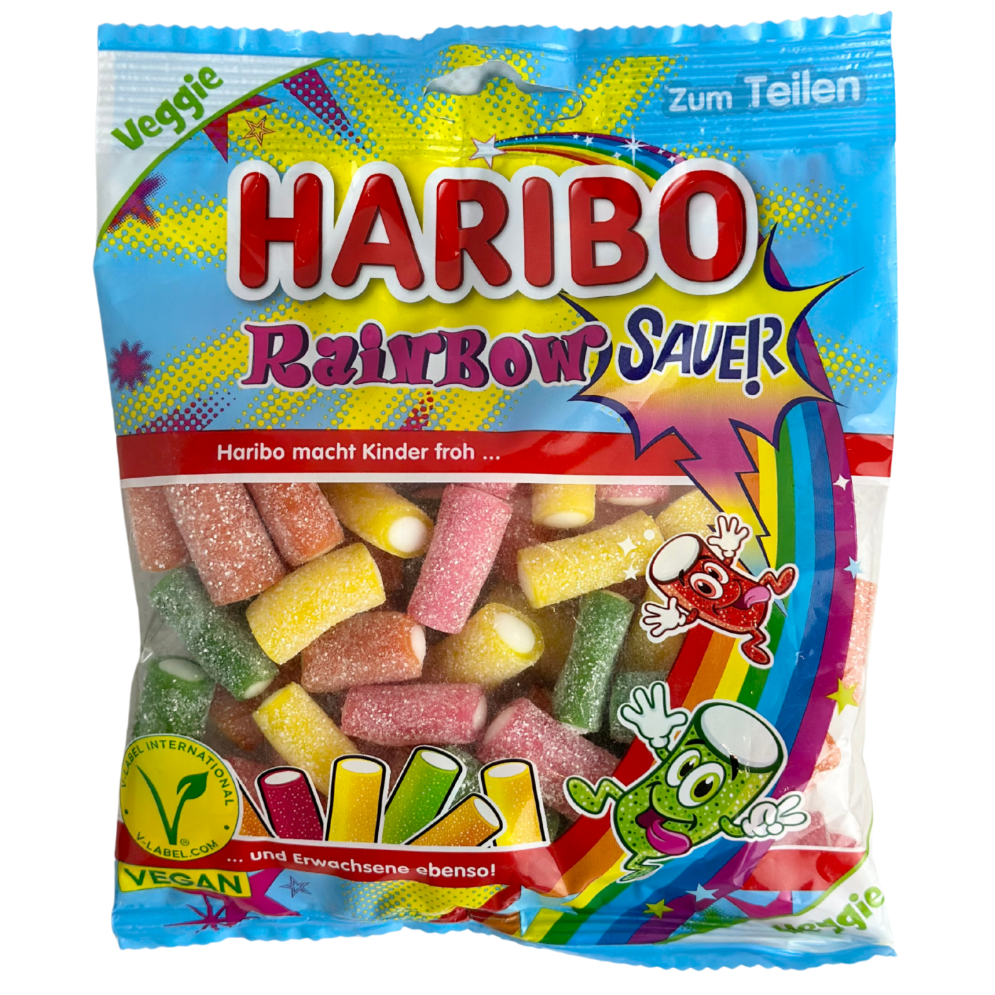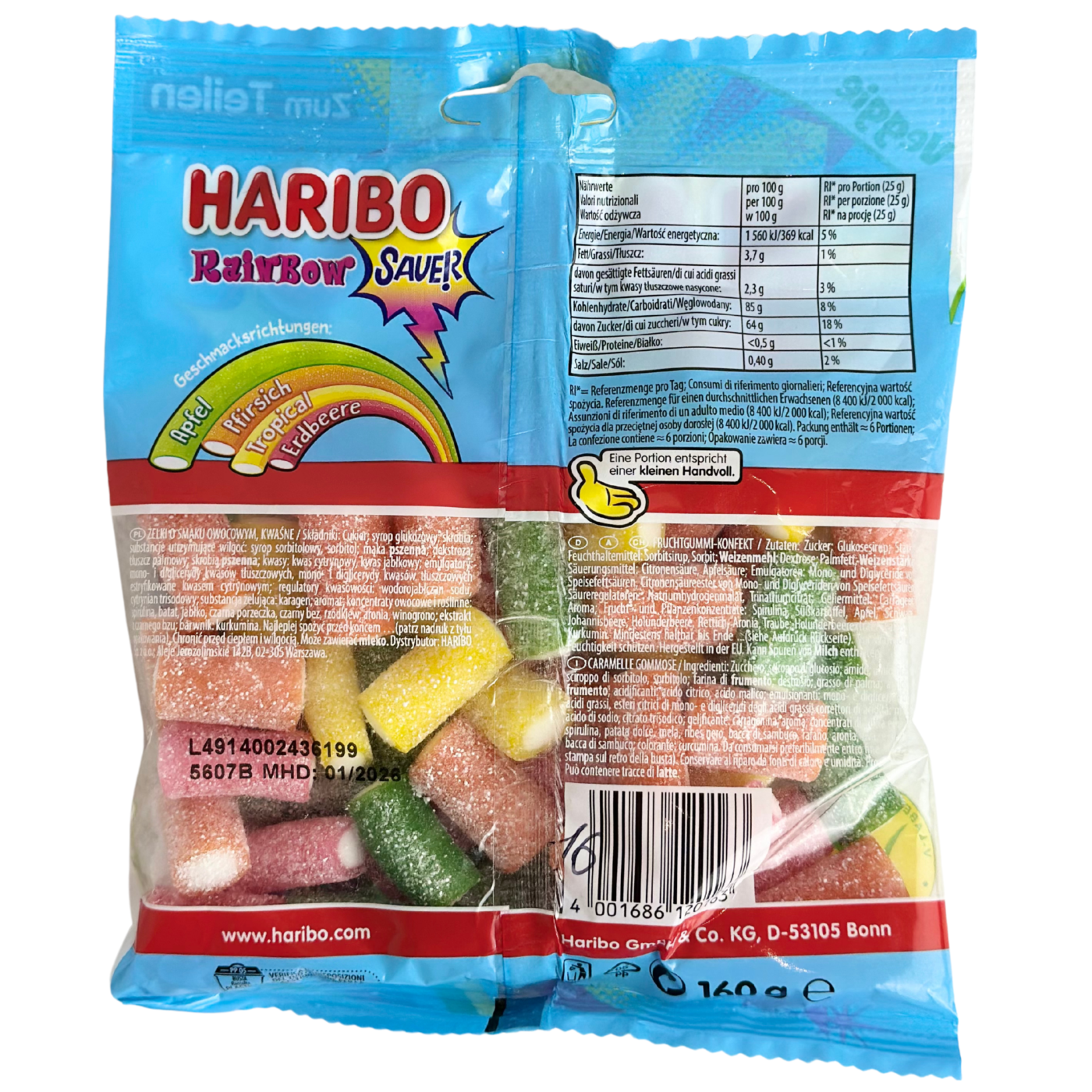 Желейні цукерки Rainbow - це чудові різнокольорові желейки з з кислим смаком. В упаковці містяться такі смаки як ароматна малина, лимон, апельсин, полуниця та смаки інших фруктів.  Не містить жирів та штучних барвників, виробники використовують лише натуральні інгредієнти. Цей продукт підходить для дитячих свят та вечірок, а також як солодкий перекус на кожен день.