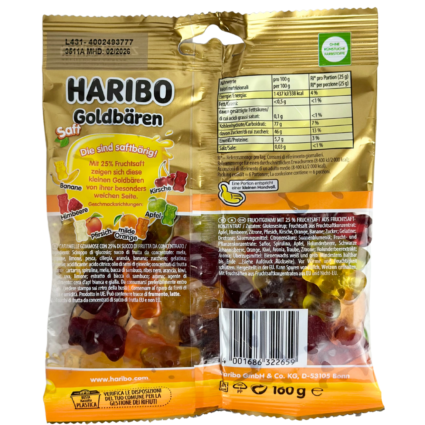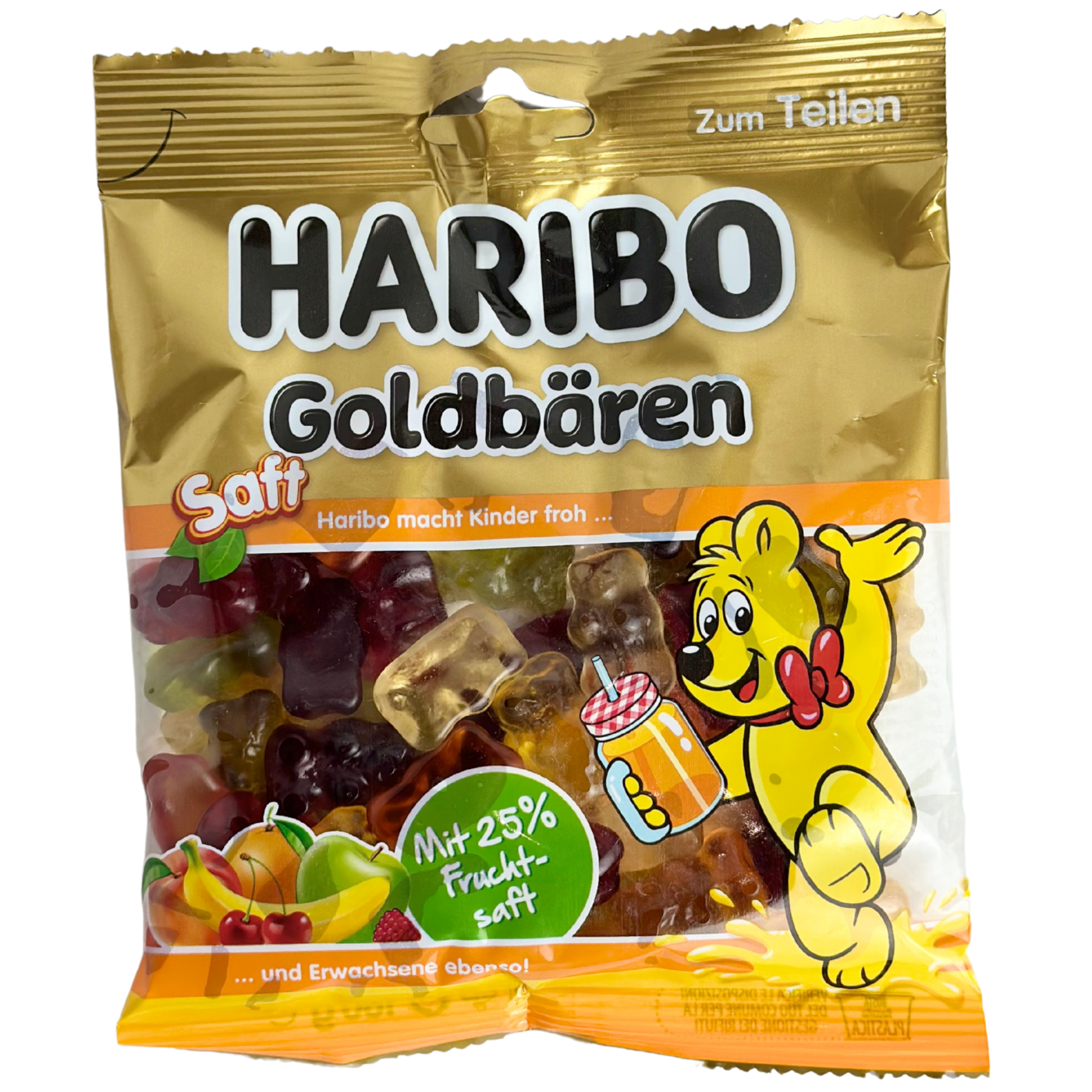 Насолоджуйтеся вишуканим смаком ведмедиків Haribo Goldbaren Saft з фруктовими нотами яблука, ніжного апельсина, малини, персика, вишні та банана. Вміст фруктового соку 25% робить їх особливо м’якими та надзвичайно соковитими. Цукерки Haribo Candy дебютували у світі цукерок у 1922 році. Вони відомі тим, що створили перших у світі гумових ведмедиків. За ці роки Haribo значно розширилися, пропонуючи нам незліченну кількість форм, смаків і розмірів смачних желейок.