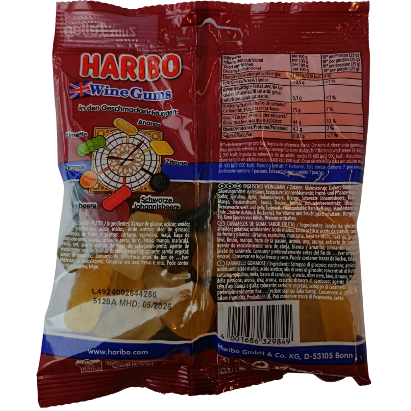 Жувальні цукерки Wine Gums — це традиційні винні гумки в британському стилі, але виготовлені в Німеччині. Ці високоякісні винні гумки для гурманів, які мають чудові міцні смаки чорної смородини, ананаса, лимона, лайма, апельсина та малини. Цукерки створені для справжніх поціновувачів. Їх зручно брати з собою на перекус в дорогу, на роботу чи просто насолоджуватися під час перегляду фільму.