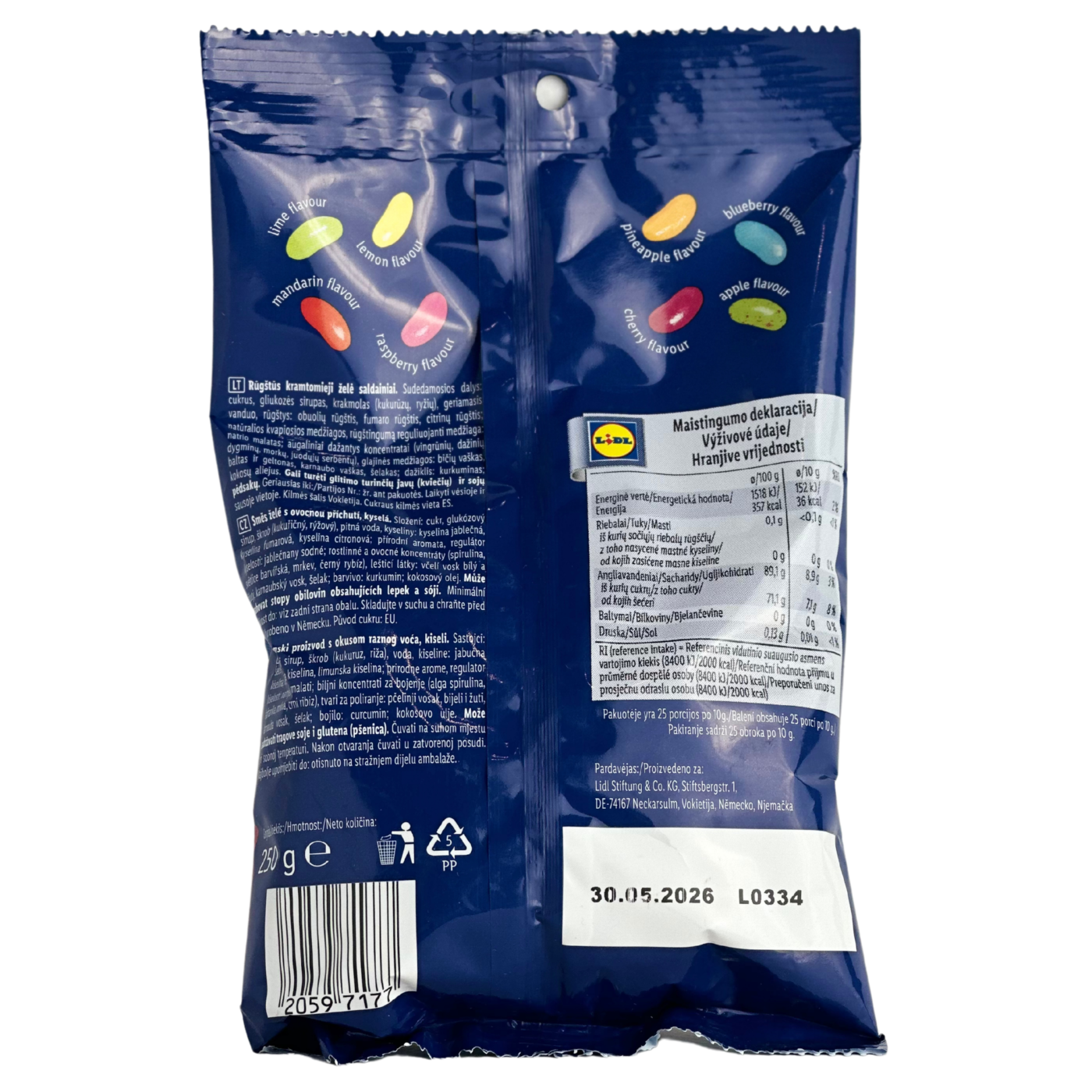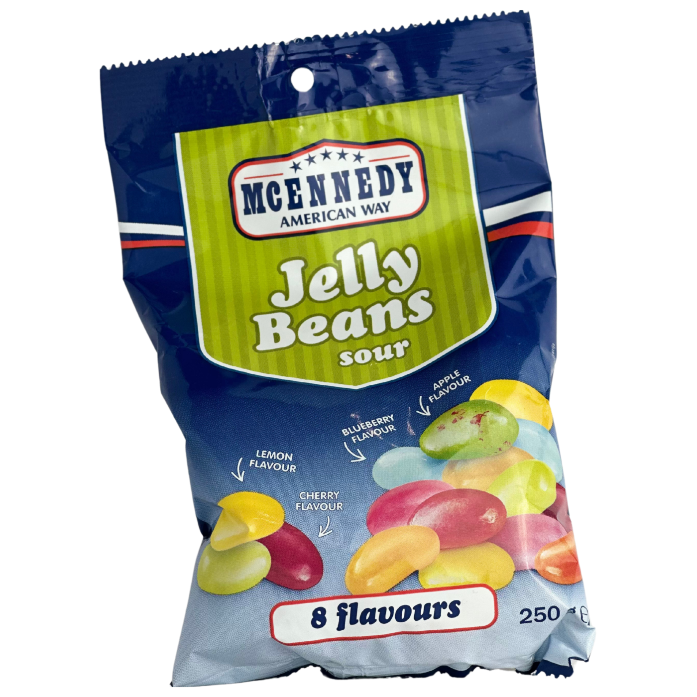 Jelly Beans sour від MCENNEDY – смачні желейні боби в кольоровій глазурі, які мають оригінальні смаки з кислинкою. В одній упаковці 8 смаків, серед них: вишня, лимон, яблуко, лохина та інші.